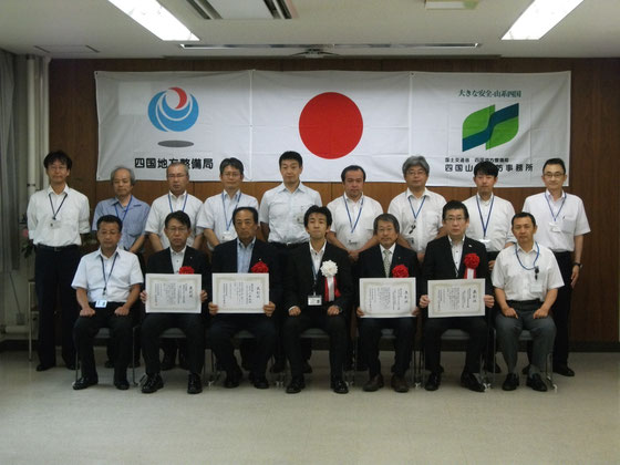 平成26年7月30日に吉野川ダム統合管理事務所おいて平成26年度国土交通行政関係功労者表彰式があり、「平成25年度 早明浦ダム南越地区進入路設計業務」が優良業務表彰を受賞しました。
