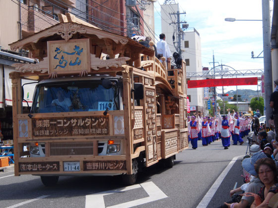 (株)第一コンサルタンツでは、平成20年よりよさこい祭りに出場する「本山さくら」チームの地方車を応援している。
