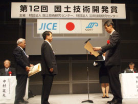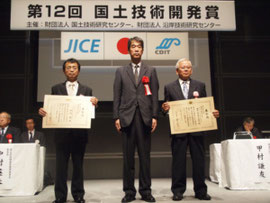 (株)第一コンサルタンツと田中工業(株)が応募者、当社の右城社長と田中工業の田中会長が技術開発者としそれぞれ表彰され、国土交通大臣前原誠司の直筆のサインが入った表彰状と副賞の盾を戴きました。