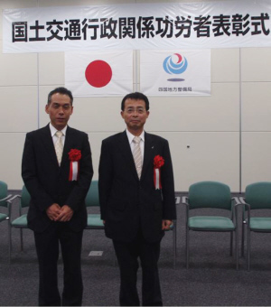 平成22年7月21日(水)に高松サンポート合同庁舎の13階の会議室で平成22年度国土交通行政関係功労者表彰式がありました。 四国技術事務所から当社がプロポーザルで受注していた「平成21年度災害時における受援体制検討業務委託」が、平成22年度国土交通行政関係功労者表彰において優良業務表彰(局長表彰)を、また管理技術者の酒井寿彦課長補佐が優秀建設技術者業務表彰(局長表彰)を受賞しました。