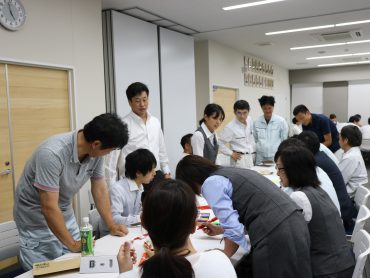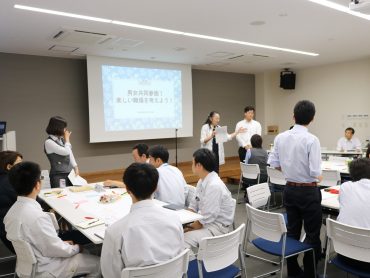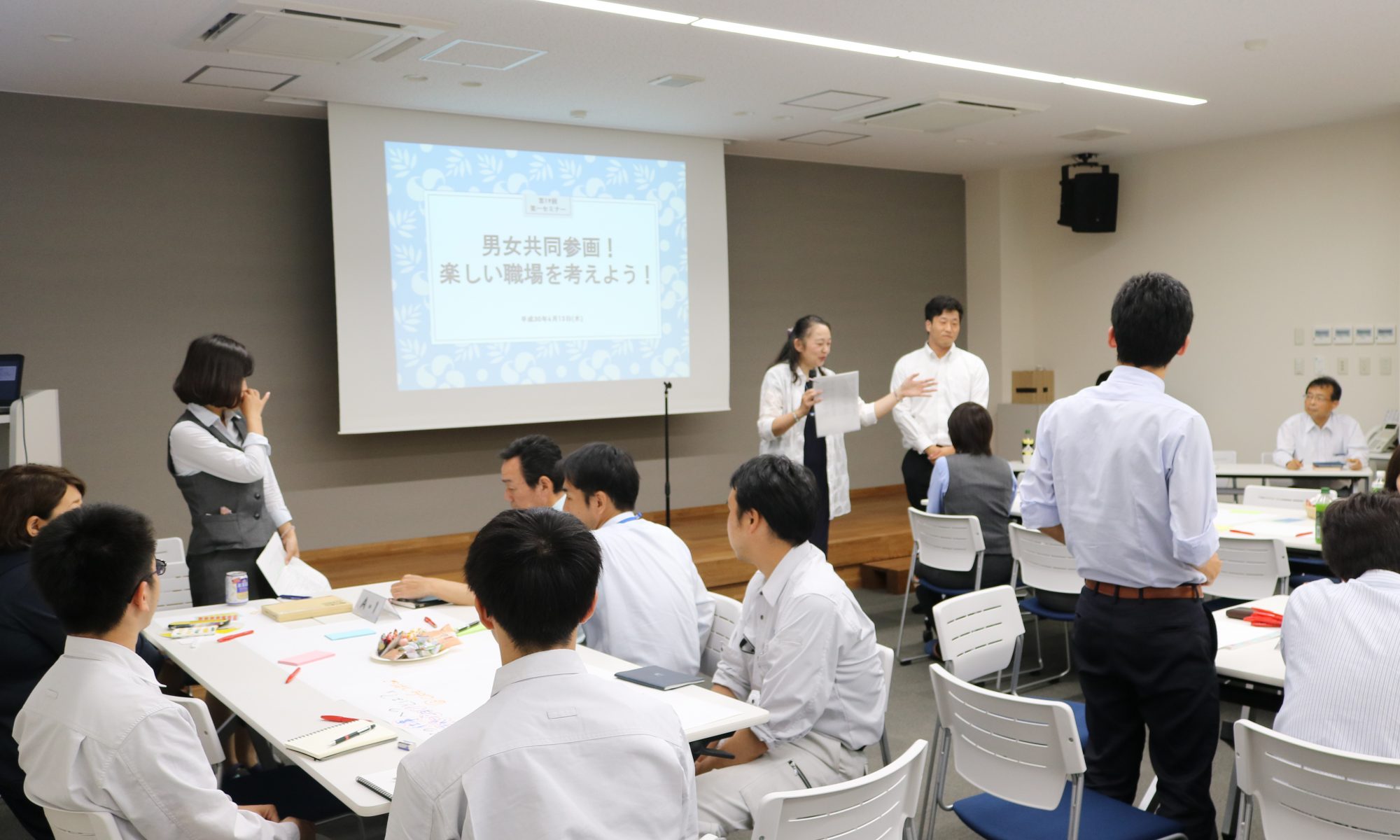 「男女共同参画!楽しい職場を考えよう!」をテーマに、「ワールドカフェ」と呼ばれる手法でグループごとに話し合いを行いました。グループの進行役であるカフェマスターを若手社員が努めたこともあり、どのグループもリラックスした雰囲気で意見を出し合っていました。