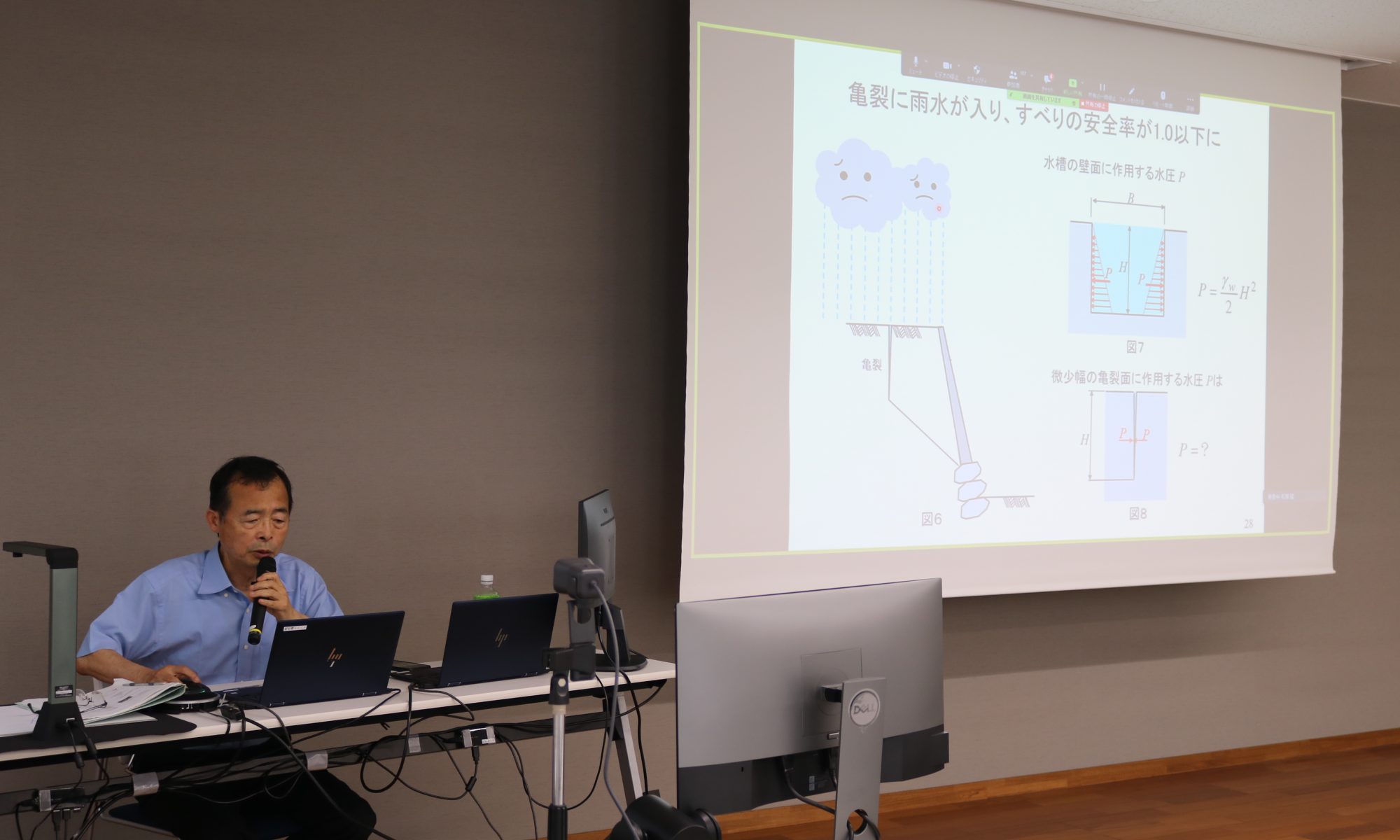 6月30日(水)、公益財団法人鳥取県建設技術センター主催のWEBセミナーがありました。内容は「トラブル事例から学ぶ擁壁設計」です。講義は、弊社社長の右城が社員に対して講義するとともに、その講義内容をライブ配信するという形態で行いました。参加された119名の皆さんはとても熱心に聴講されており、質疑応答も時間いっぱいまで行われました。