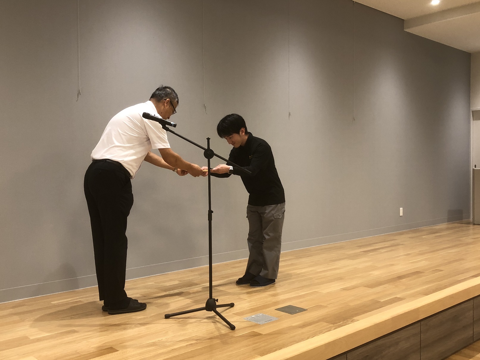 今年度の最優秀発表賞は、防災まちづくり課の坪田主任です。わかりやすいスライド、堂々とした発表、質問に対する適切な回答、どれも素晴らしかったです。