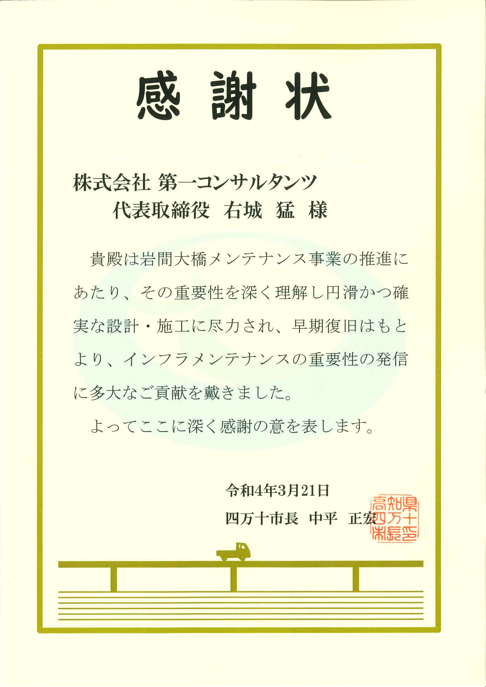 弊社の調査設計に対する取り組みに対して、四万十市長から感謝状をいただく栄誉に浴すことができました。