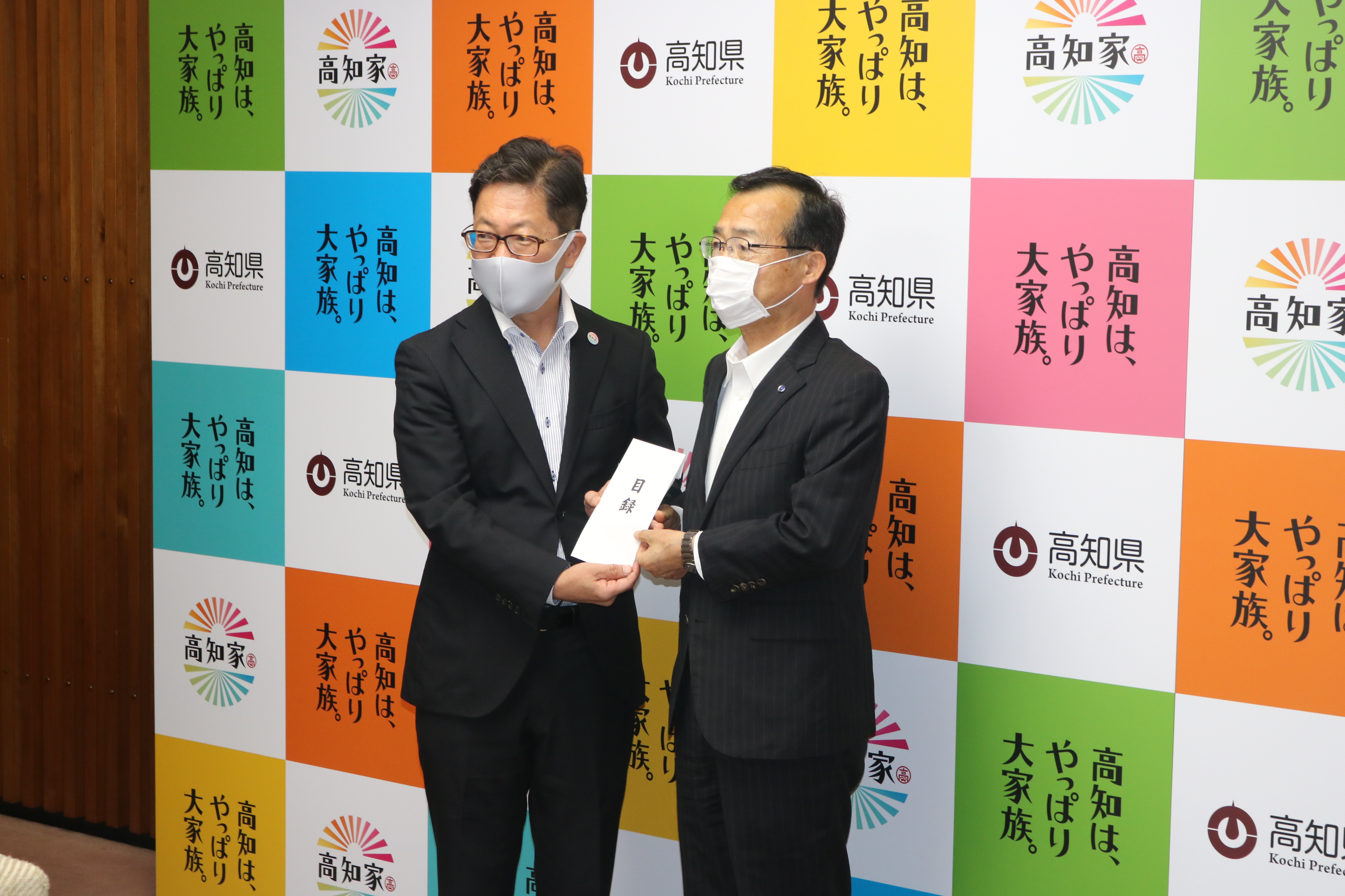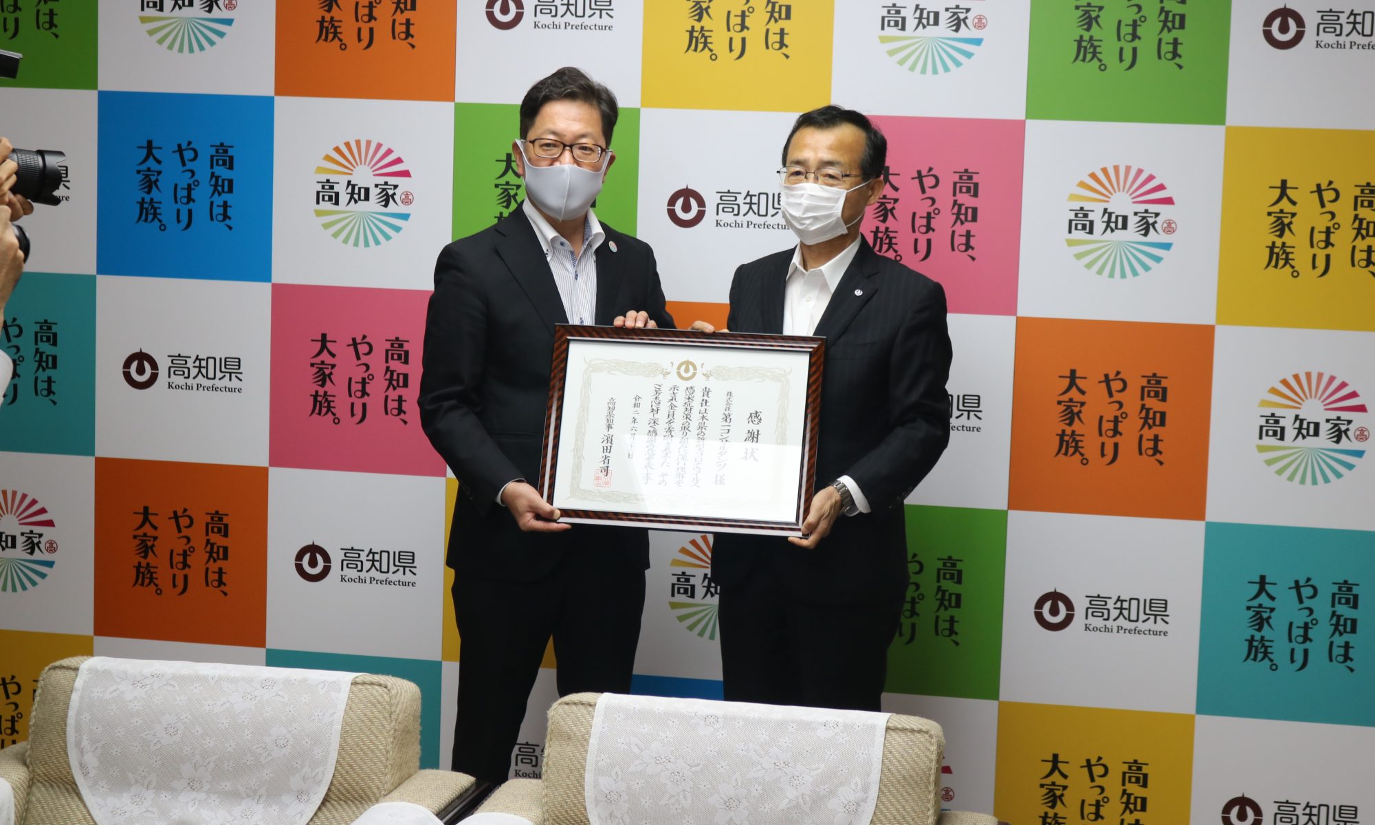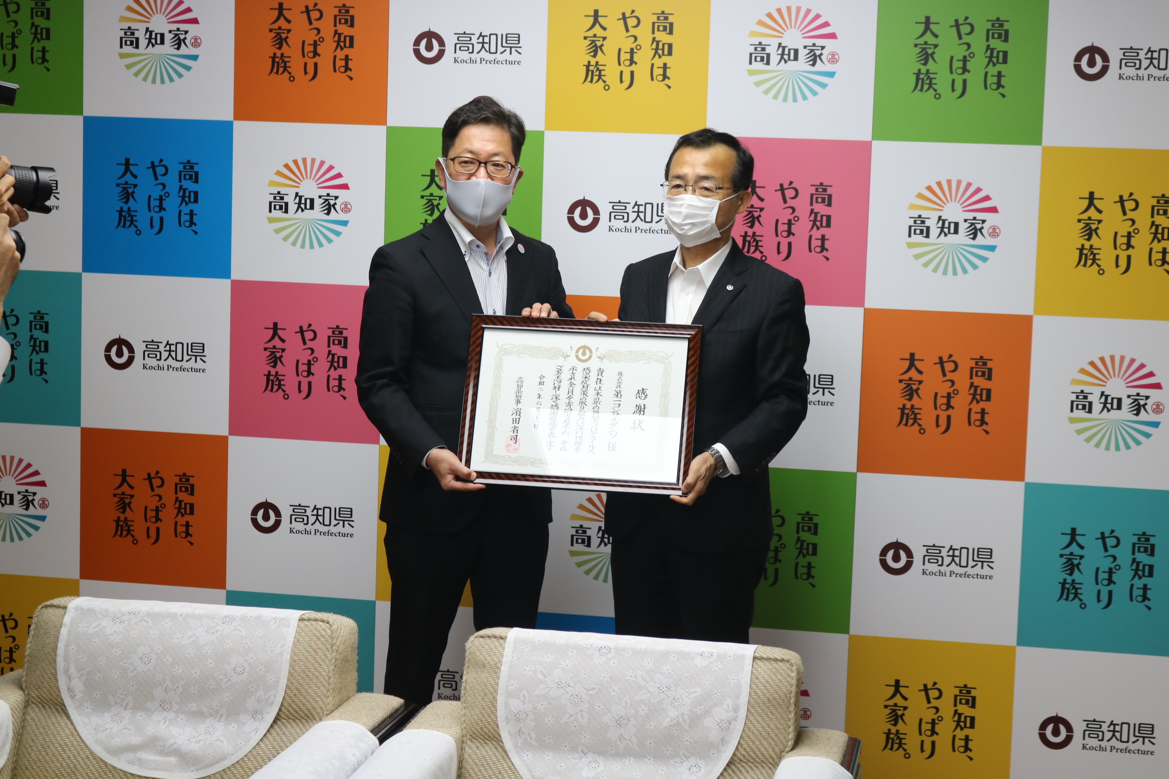 これは現在、高知県が呼びかけている「高知県新型コロナウイルス感染症対策助け合い寄付金」に協力するものです。贈呈式の席上、濵田省司知事からは、当社が活用を希望した同感染症に係る経済影響対策に関する事業にお使いいただけるとのお言葉があり、感謝状をいただきました。
