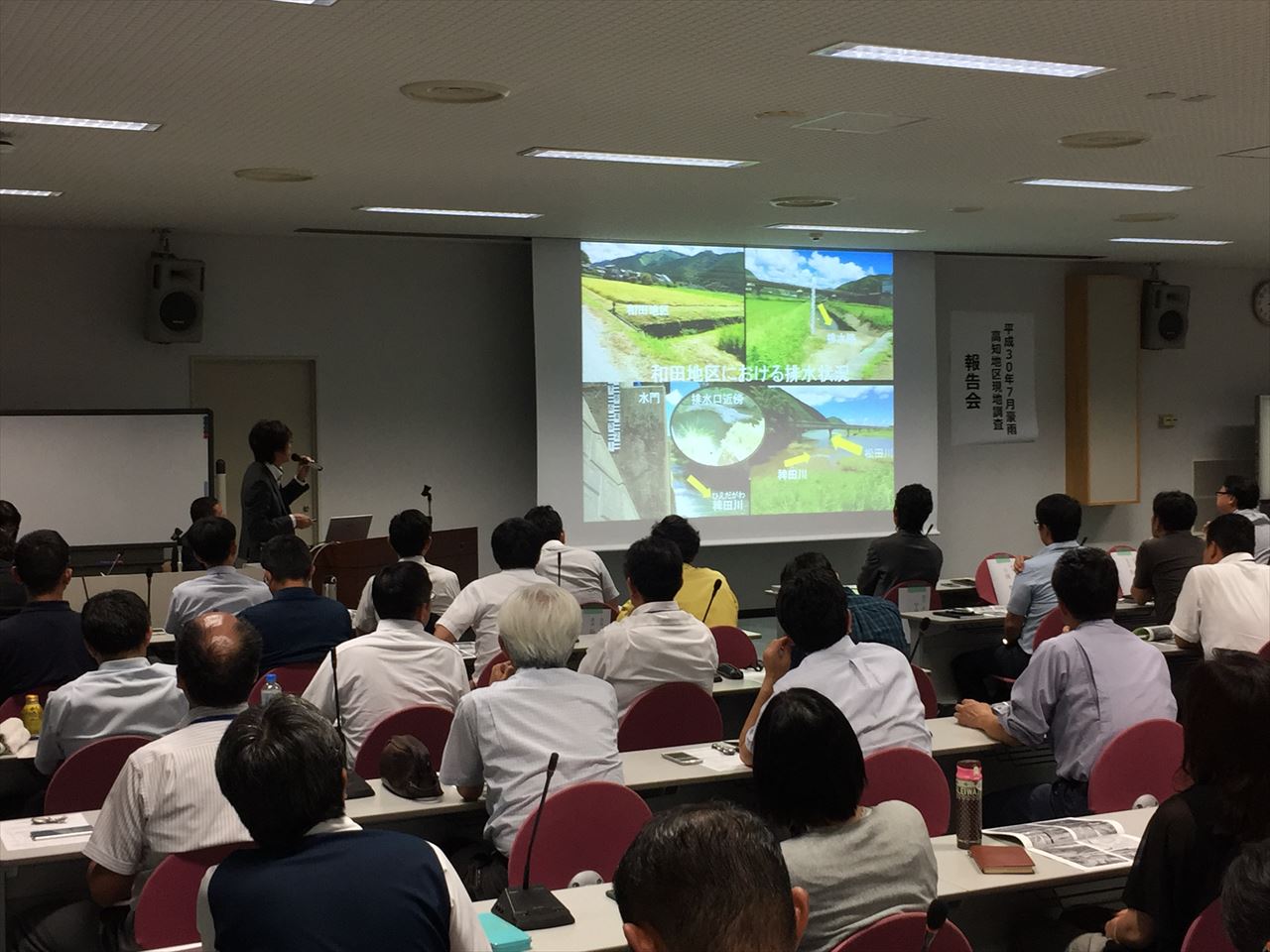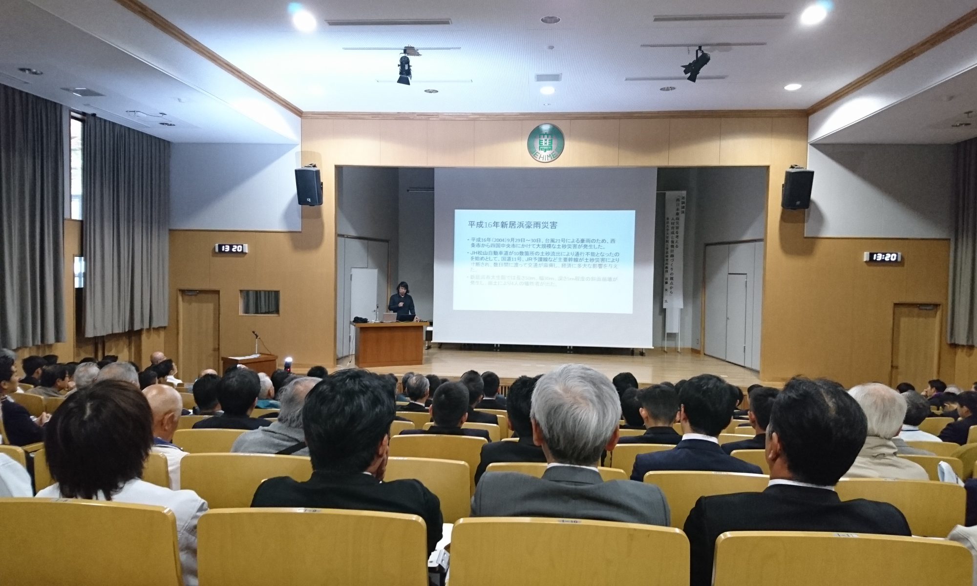 弊社からは、片岡寛志(河川調査)、松本洋一(避難行動調査)、の2名が調査団の一員として報告を行いました。速報会には県内の行政関係者、土木技術者ら約150名の参加があり、頻発する豪雨災害への関心の高さがうかがえました。調査にあたって、あらためて日頃からの産官学と地域連携の重要性を感じました。被災後の多忙な中ヒアリング調査や資料提供等にご協力いただいた行政や住民の方々に感謝します。貴重な教訓を今後の業務にも活かしたいと考えています。