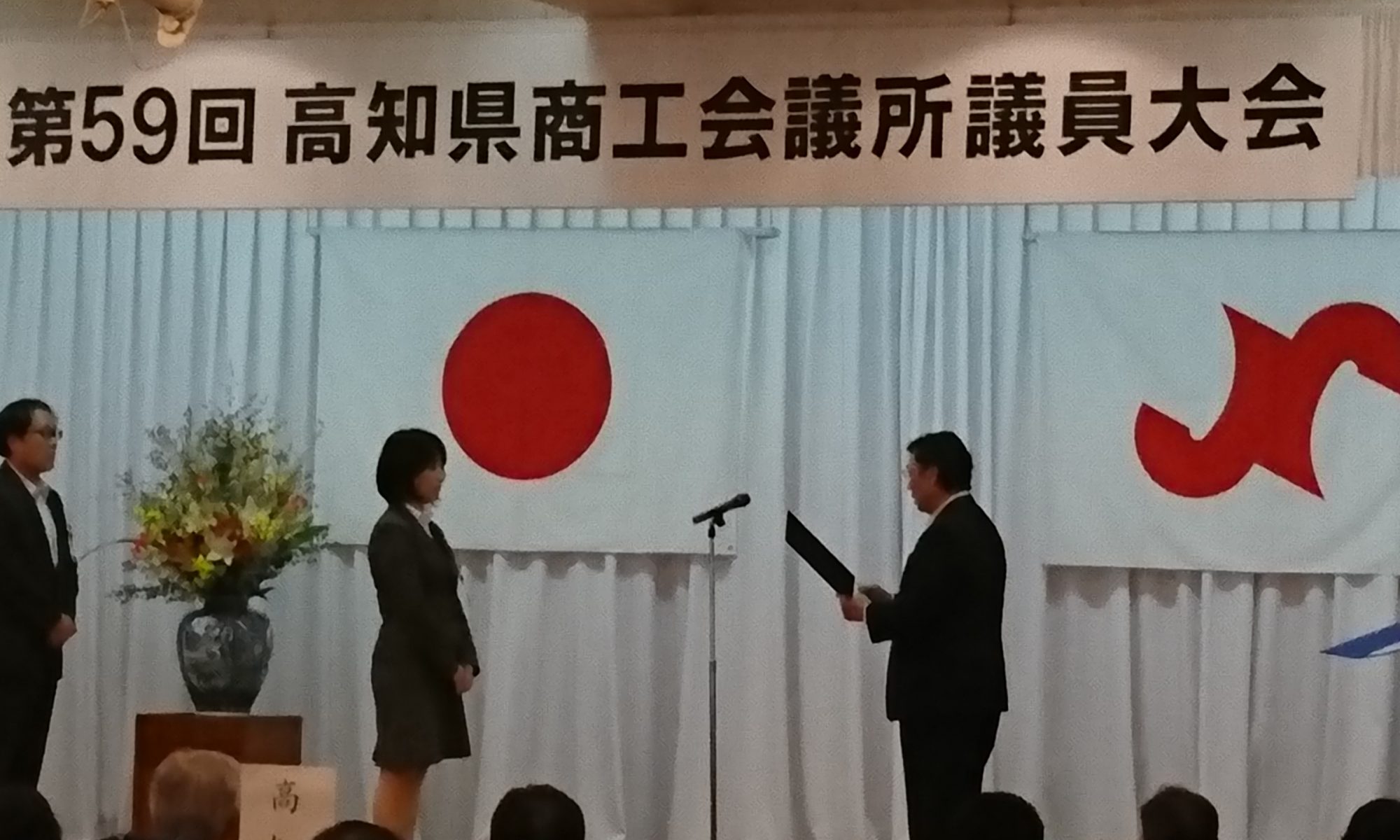 10月23日に開催された高知県商工会議所連合会の第59回議員大会において、河川砂防課の冨永敏絵さんに平成30年度優良従業員の表彰状と記念品を授与していただきました。