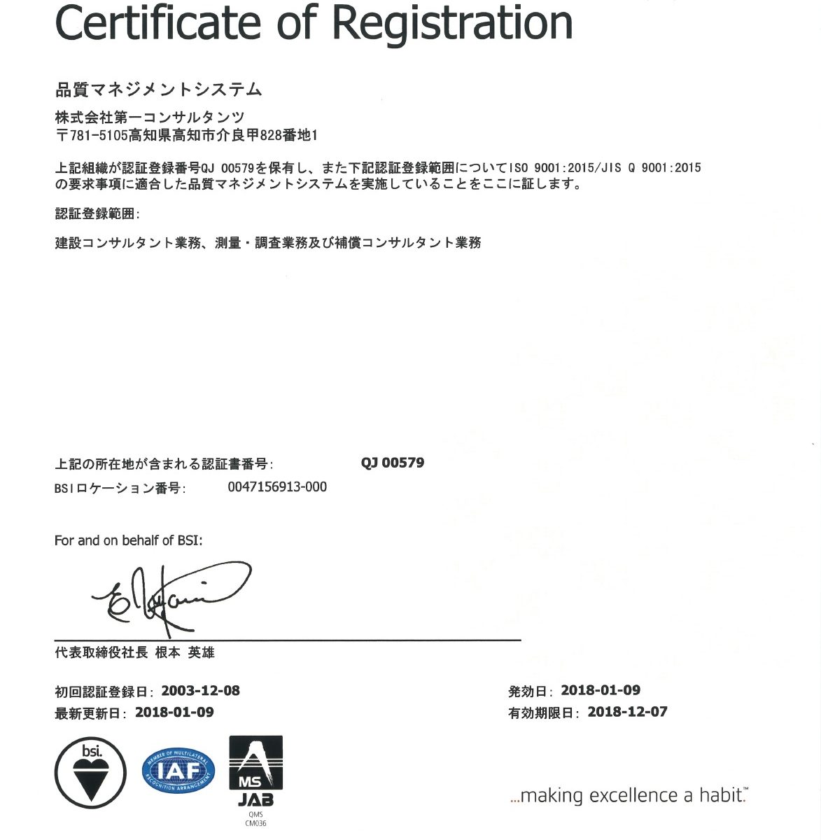 ISO 9001:2015版移行の認証登録完了(2018/01/12)