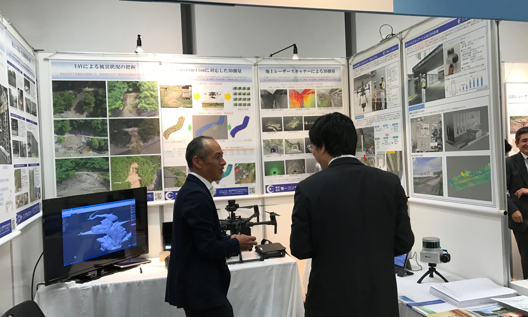 弊社は、ドローンや地上形レーザースキャナーを用いた三次元測量システム、非GNSS環境下におけるドローン飛行システムを活用した橋梁点検、現在開発中の懸垂式折りたたみ足場などを出展しており、特に今年度導入した、最新のモバイルスキャナー「ステンシル」はたくさんの方々から関心を頂いております。