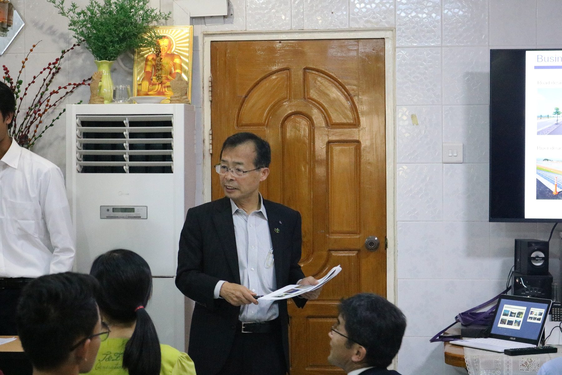 特別講演の後は、ミャンマーのアマラワディ僧院の高等学校の落成式に出席した須内部長より、落成式の状況や校舎、施設等についての報告がありました。盛大な落成式や学校の完成を本当に嬉しそうに見ている子供達の写真がとても印象的でした。