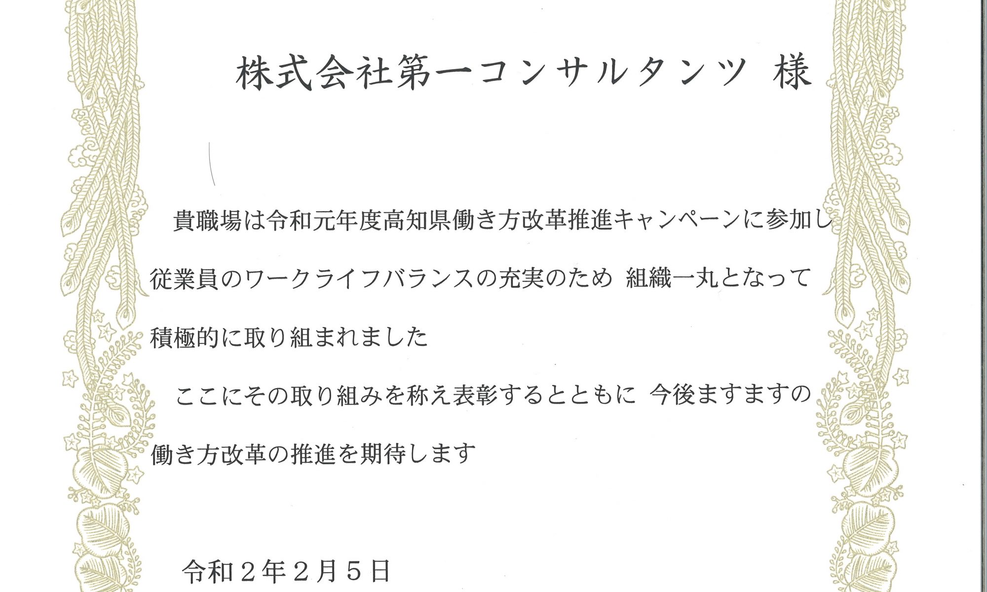 投稿日: 2月 5, 20202月 14, 2020「高知県働き方改革推進キャンペーン」奨励賞を受賞(2020/02/05) 高知県雇用労働政策課主催の「高知県働き方改革推進キャンペーン」として、8月には「ノー残業デー実施キャンペーン」、10月には「有給休暇取得推進キャンペーン」が実施され、当社も参加致しました。弊社のワークライフバランスへの前向きな姿勢と取り組みが称えられ奨励賞を頂きました。このような賞を頂きありがとうございました。これを励みに今後も働き方改革を推進していきたいと思います。