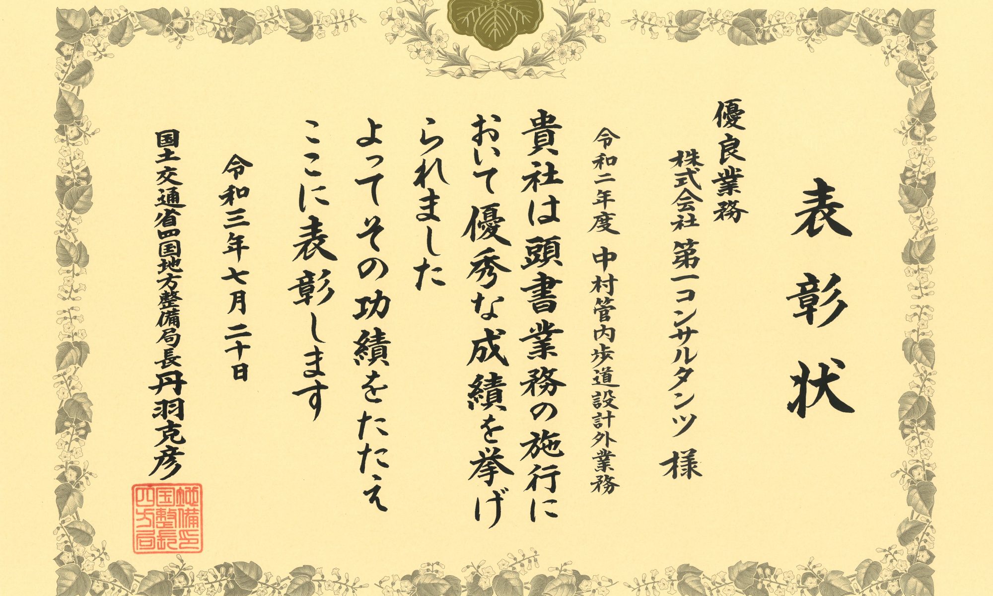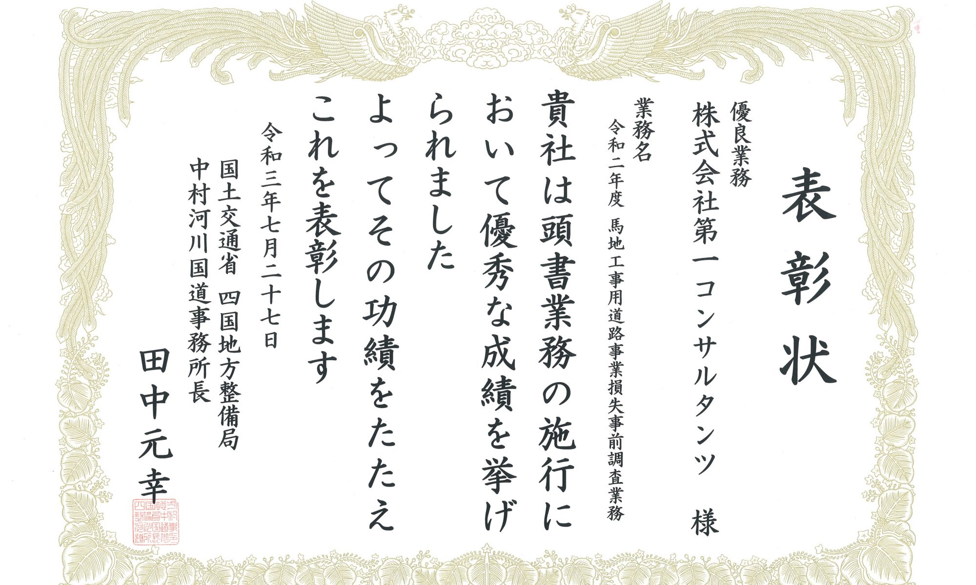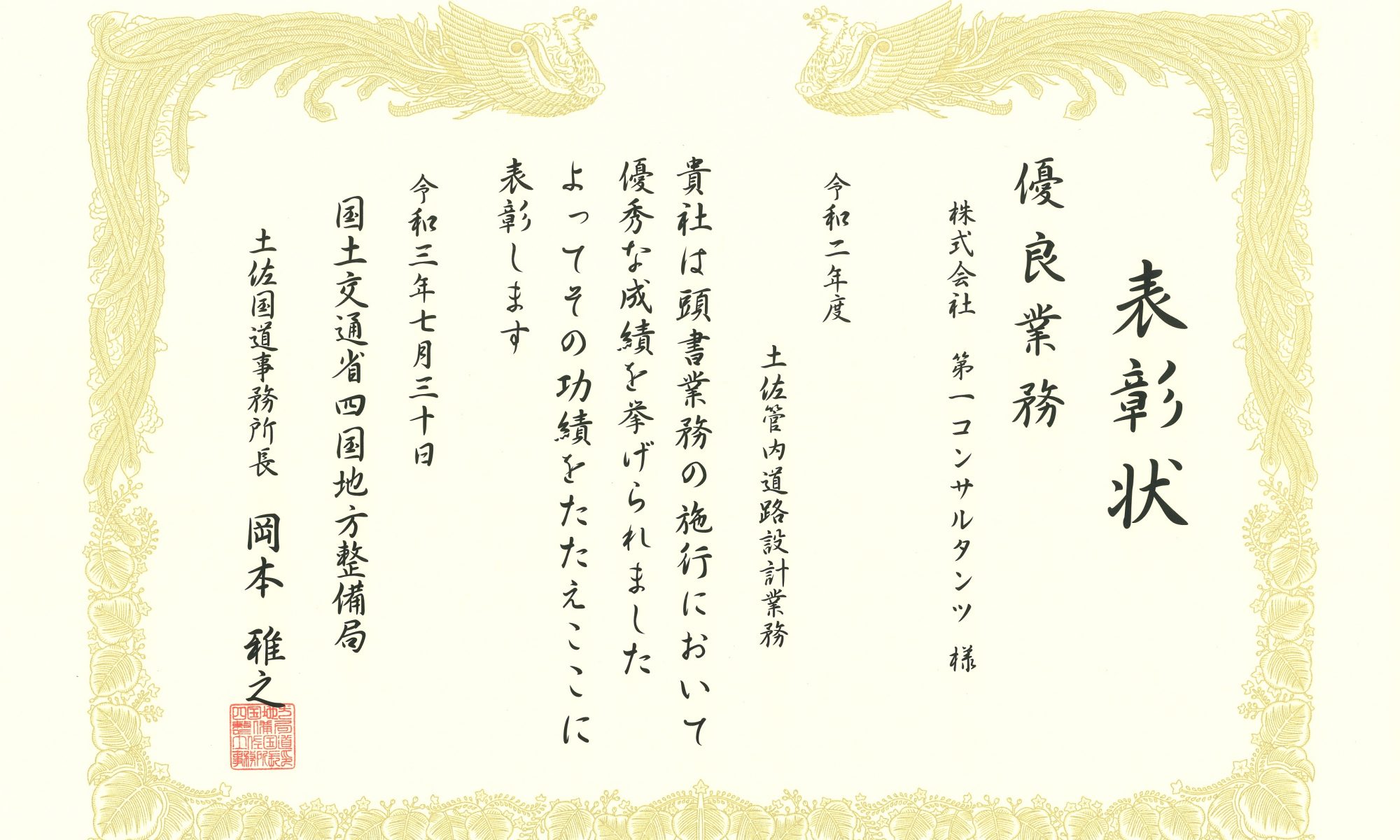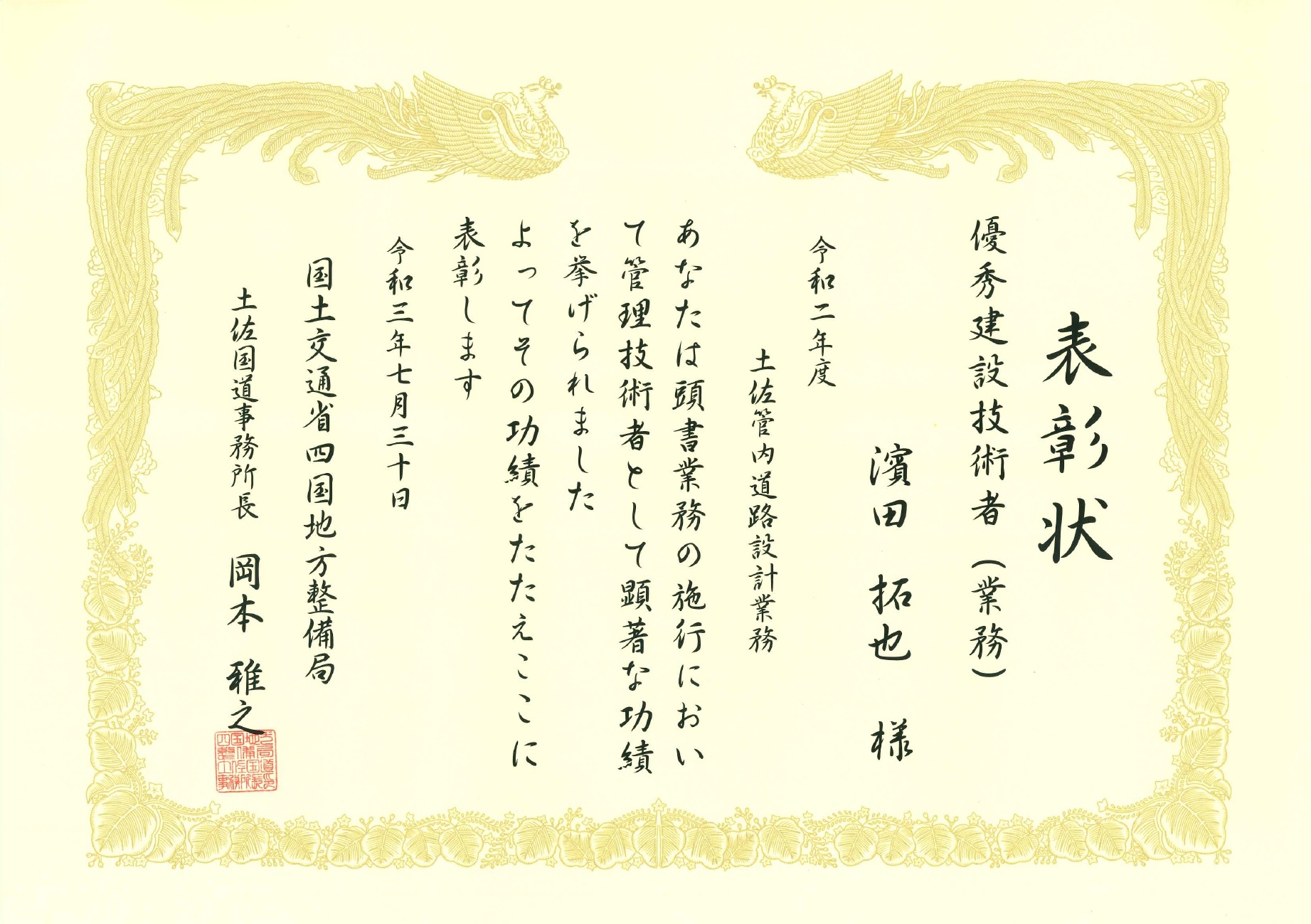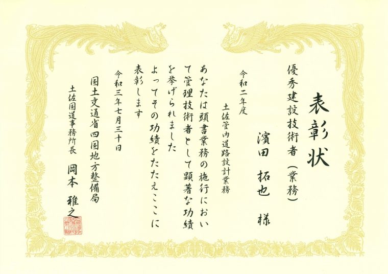 「令和二年度 土佐管内道路設計業務」が優良業務表彰、この業務の管理技術者である濱田拓也が優秀建設技術者表彰を受賞しました。