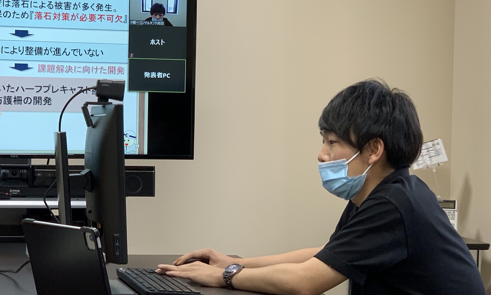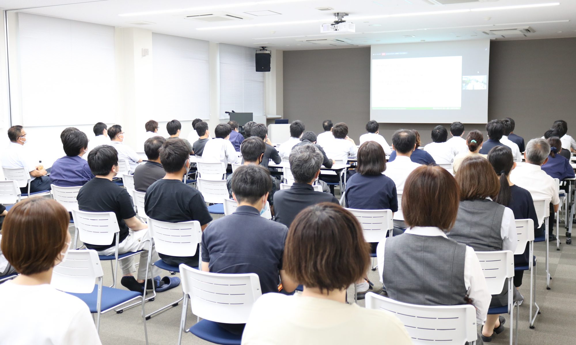本社1階研修室において、第14回目となる「令和3年度 経営方針発表会」を開催いたしました。新型コロナウイルス(COVID-19)感染症防止対策として、本社では1階研修室の他に、ロビーでも聴講出来るようにし、各支店及びミャンマーにいる新入社員とはリモート接続で実施いたしました。