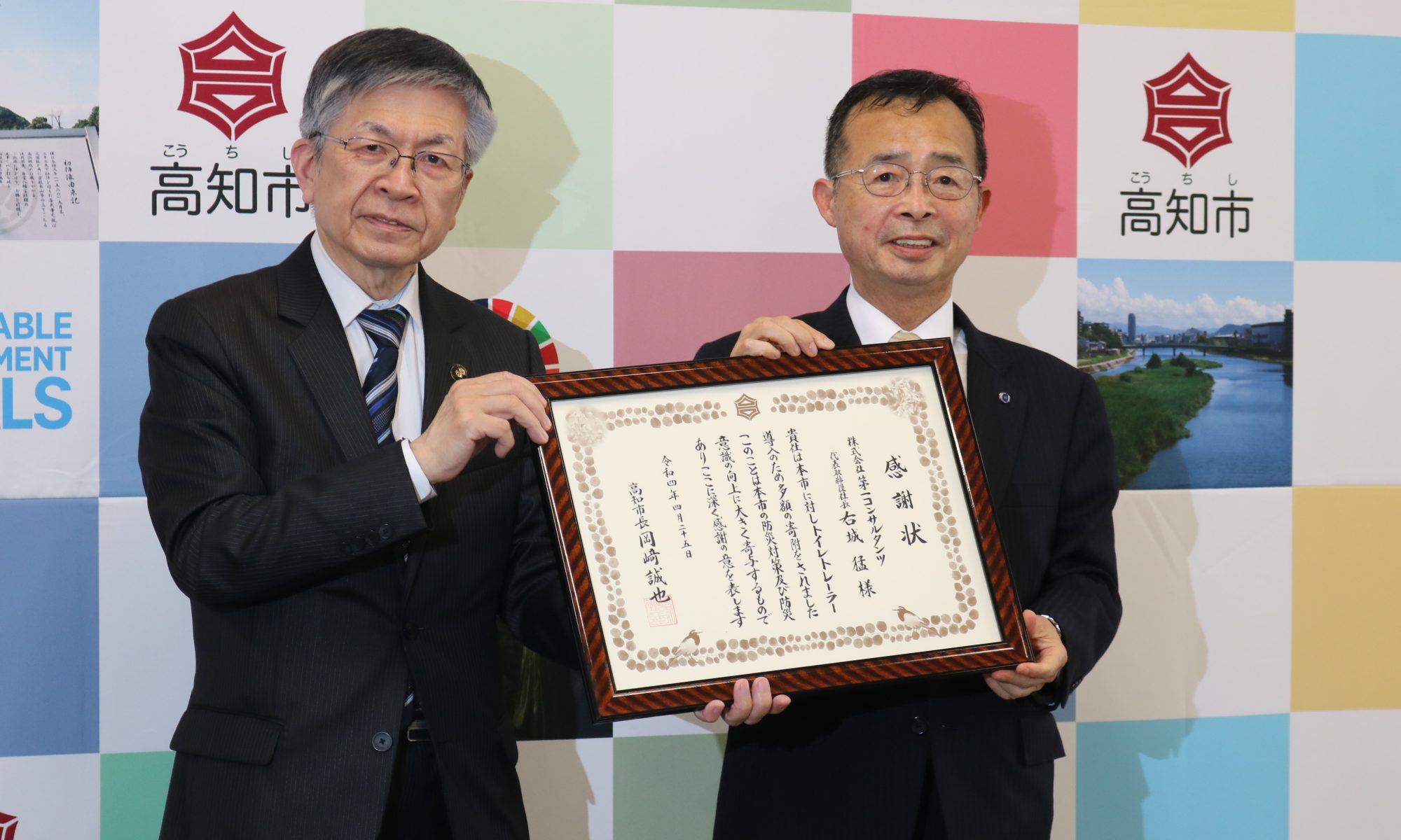昨年、高知市は”災害派遣トイレネットワークプロジェクト「みんな元気になるトイレ」”(注)への参画を決定。同市からのトイレトレーラー購入資金の支援への呼びかけに対して、当社は100万円の寄付をさせていただいておりました。