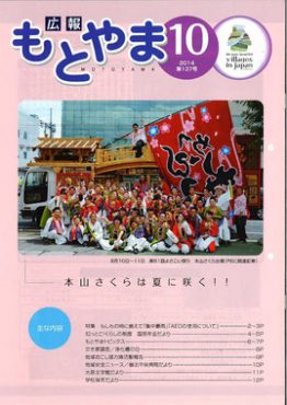 本山町の公報誌「もとやま 2014 10 第137号」の表紙には、よさこい鳴子踊りの「本山さくら」チームの写真が掲載されています。地方車に「第一コンサルタンツ」の文字が見えます。