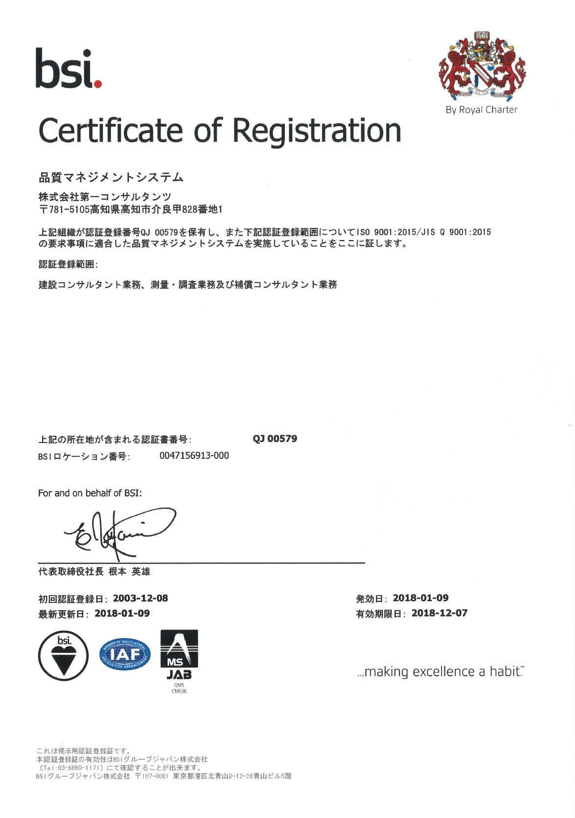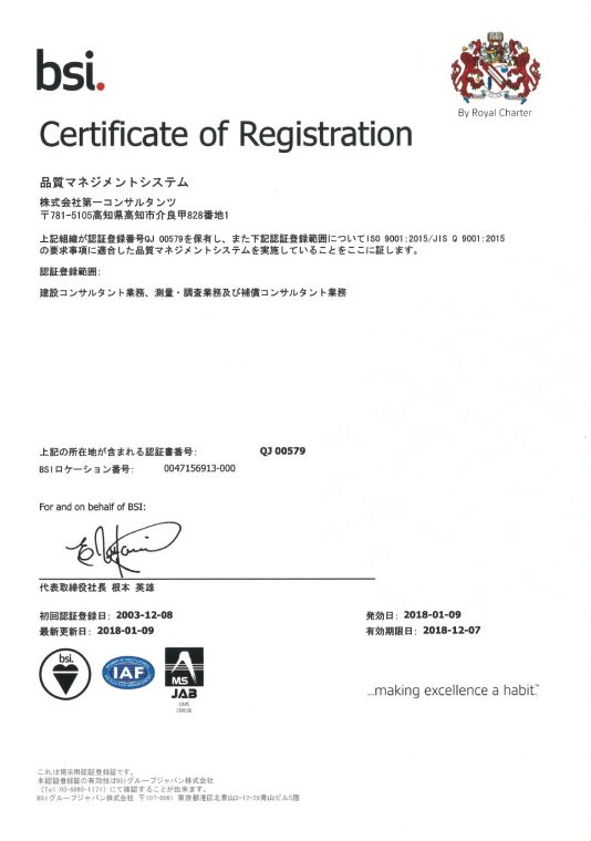 投稿日: 1月 12, 20181月 12, 2018 投稿者: daiichi-consulISO 9001:2015版移行の認証登録完了(2018/01/12) 平成29年12月にISO9001:2015版移行審査とサーベイランス審査の外部審査を受け,「2015版への移行及び認証登録の再認証登録の推薦」をいただきました。その結果を受け,平成30年1月9日付けで認証登録証を再発行をしていただきました。 当社は,「情熱・謙虚・誠実」を社訓に,「顧客から信頼される会社」を品質方針に掲げ,社業を行っています。今後とも建設総合コンサルタントとして,より一層の品質向上,顧客満足度向上に全社員一丸となり取り組んでいきます。