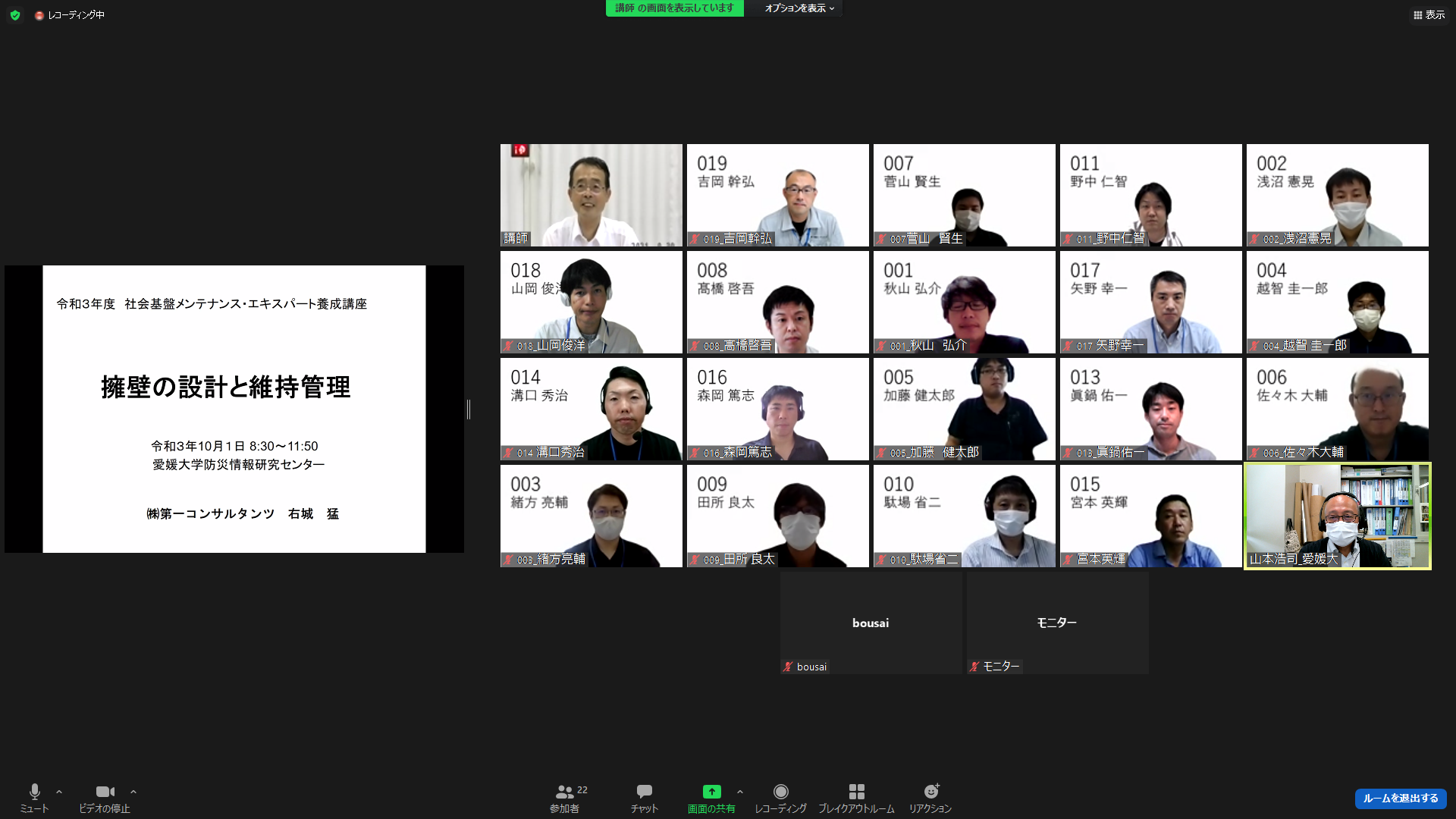 愛媛大学の特定教授である右城社長が、9月30日は「擁壁の設計法と維持管理」の講義をリモートで行いました。