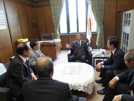 脇幹事長の話を聞く社長の右城と専務取締役の西岡
