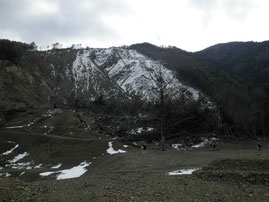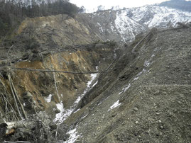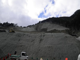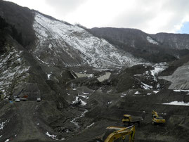 視察した斜面のうち、最も大規模な深層崩壊が発生した赤谷地区は、その崩壊規模が幅460m、高さ600m、崩壊土量940万m3であり、現地で見たその崩壊斜面は想像を絶する規模でした。これまで緊急対策として天然ダム決壊を防止するために仮排水路を施工するが、何度もその後の豪雨により破壊され、その対策にかなりの苦労をされていました。