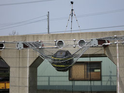 防護柵実験専用に作られたコンクリート構造の基礎に,ストロンガー工法(柵高2m,支柱間隔3m×5スパン)を水平に取り付け,0.78tの重錘を13.07mの高さから自由落下させる実験でした。防護柵に持ち込まれる重錘エネルギーは100kJであったのですが,見事に重錘を受け止めました。