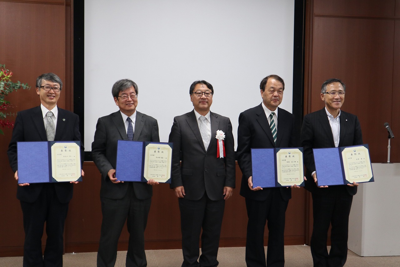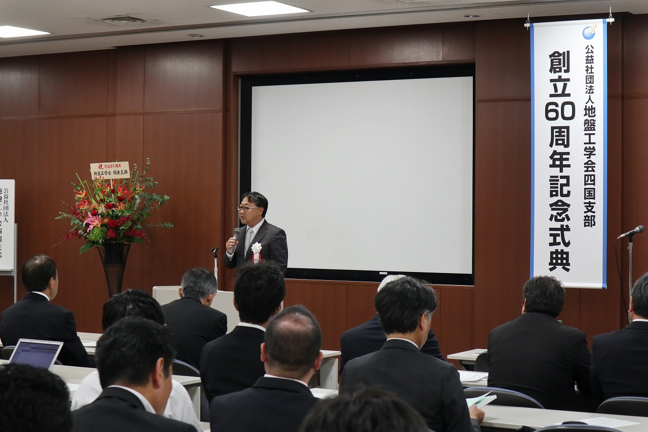 第一部の記念シンポジウムでは、四国支部における過去10年間のトピック的な研究と技術開発について6編のお話を聞くことができました。この内の1編は、右城の「高エネルギー吸収型落石防護ネット「ロングスパン工法」の開発」です。第二部の記念式典では、支部長挨拶、来賓祝辞、60周年経緯報告、表彰などが行われました。表彰では、弊社相談役でもある愛媛大学の矢田部名誉教授が、功労賞を受賞されました。第三部の祝賀会は、場所をJRホテルクレメント高松に移し、参加者全員で60周年を迎えた四国支部を祝いました。この記念行事には、約100名の方が参加をされ、大変な盛会となりました。