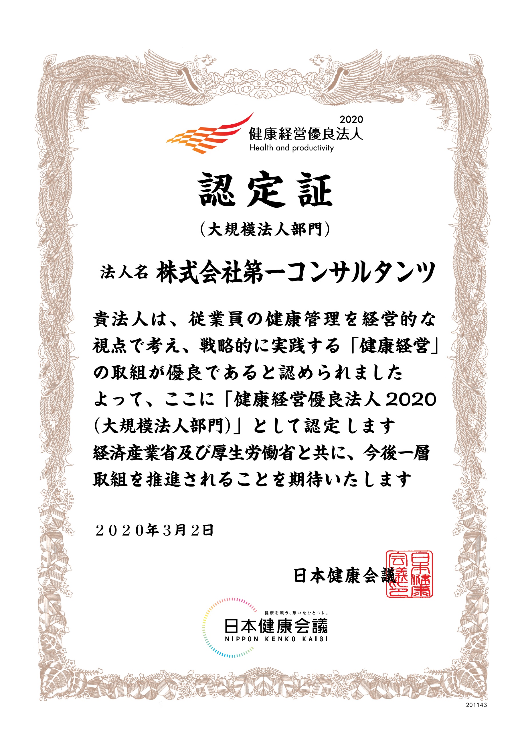 3月2日付けで、当社は経済産業省が行う2020年度の「健康経営優良法人認定制度」の大規模法人部門に認定されました。