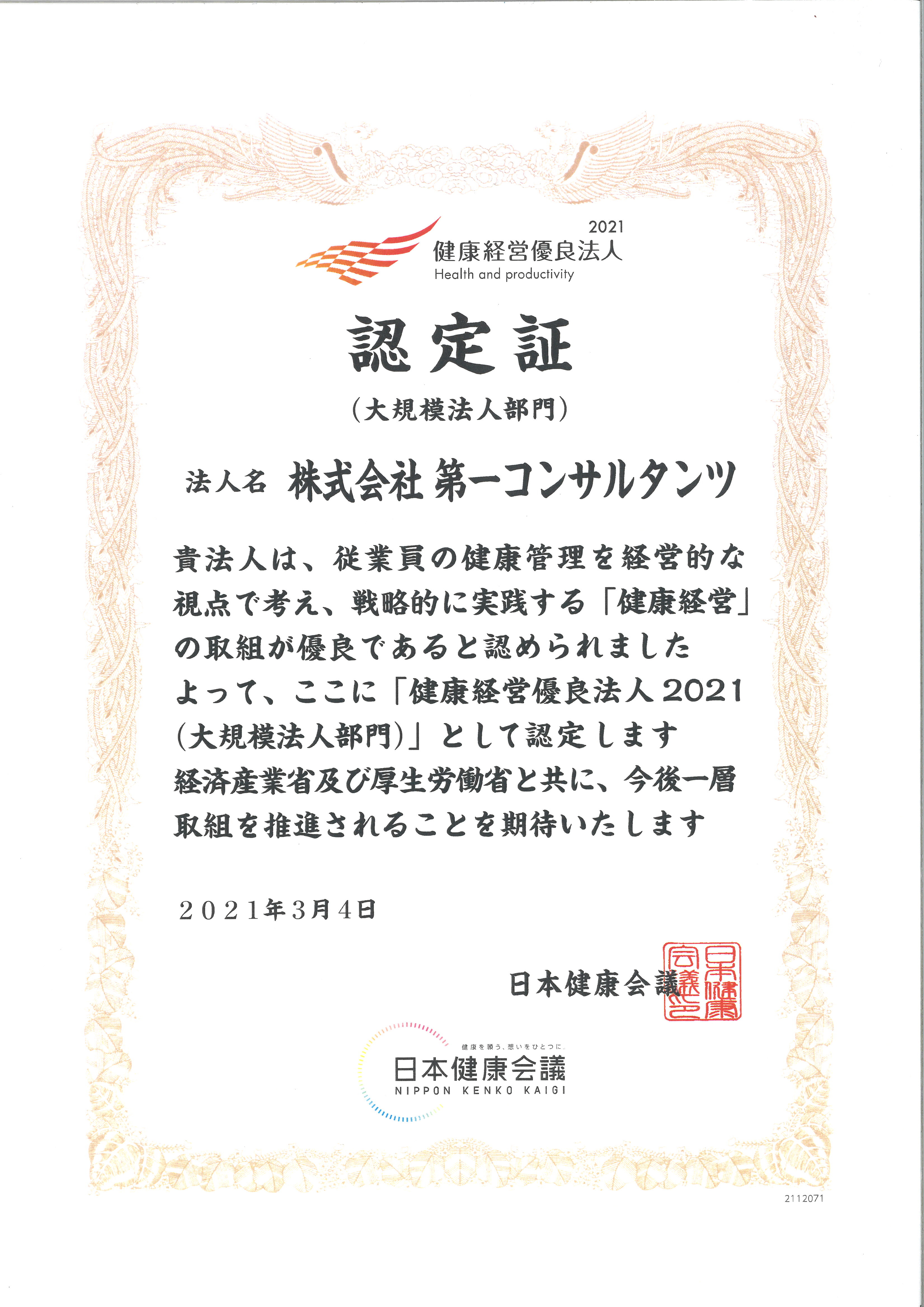 投稿日: 3月 4, 202110月 19, 2021 投稿者: daiichi-consul「健康経営優良法人2021(大規模法人部門)」2年連続で認定(2021/03/04) 3月4日付けで、当社は経済産業省が行う2021年度の「健康経営優良法人認定制度」の大規模法人部門に認定されました。 同制度は地域の健康課題に即した取組や日本健康会議が進める健康増進の取組をもとに、特に優良な健康経営を実践している大企業や中小企業等の法人を顕彰する制度です。 認定されたのは全国で1801法人、高知県内では8社、四国島内でも34社のみであり、選定された企業の顔ぶれを見ても、蒼々たる企業が名を連ねており、大変名誉ある認定となりました。 当社は今後も健康経営に邁進して参ります。