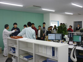 その後、当社社員の片山(愛媛大学H27卒)が社内を案内させていただき、実際の仕事風景や内容を学生さんに説明させていただきました。熱心に質問をする学生の姿に説明者も力が入り、限られた時間の中で精一杯説明をさせていただきました。