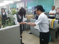 提案箱は、日本一のコンサルタントをめざして、会社が成長するためには、考え続けることが大切ということで今年度より設置したもので、提案者には採用不採用にかかわらず各月の朝礼で一案500円支給しています。本日、第1回目は、10件を超える提案があり、提案者に社長より手渡しました。今回の提案は、今後検討していく予定ですが、即実践できるような提案についてはすぐに取りかかっていきます。