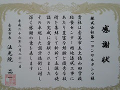 平成26年8月21日に、香美市立土佐山田学校給食センターの落成式があり、香美市立土佐山田学校給食センター用地造成工事の業務に対して、香美市長より感謝状をいただきました。当社は、この業務において、測量設計及び開発許可についての業務を遂行していました。