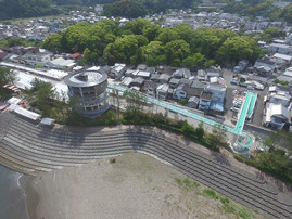 避難施設のメインとなる避難タワーは、株式会社若竹まちづくり研究所(代表取締役 佐藤八尋)が、連絡橋(水色)を当社が設計しました。