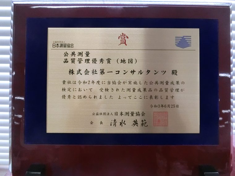 この賞は、平成17年に「公共工事の品質確保の促進に関する法律(品確法)」が施行されたのを機に創設されたもので、日本測量協会が検定した公共測量成果品で品質の優れた会社を表彰しています。