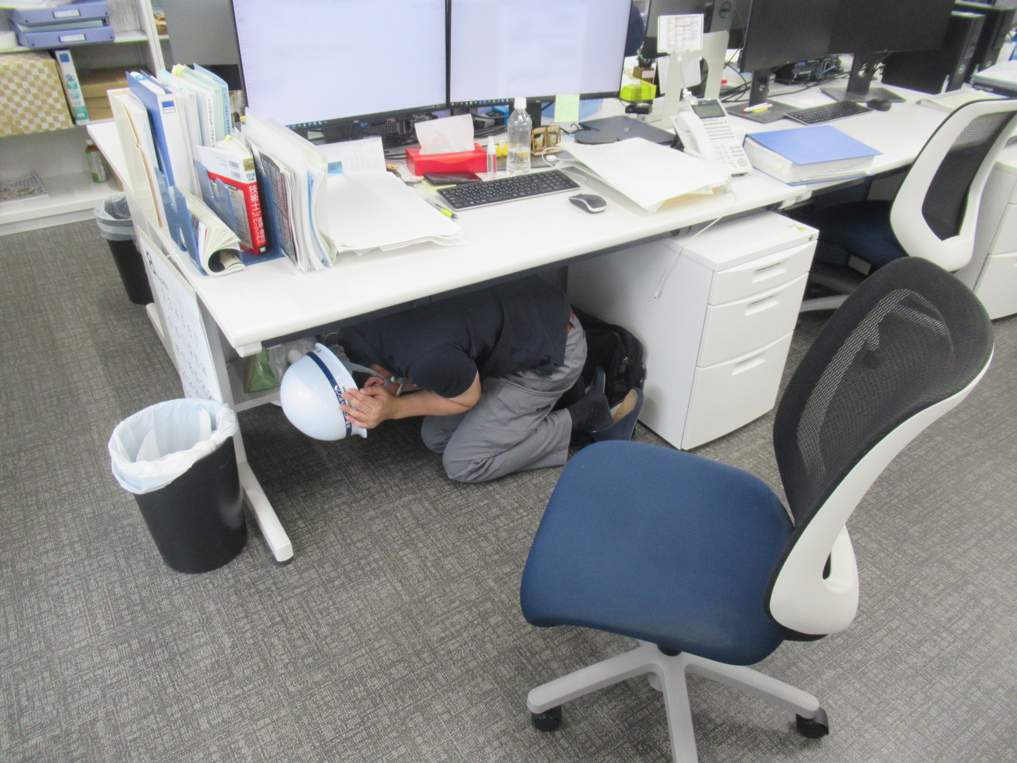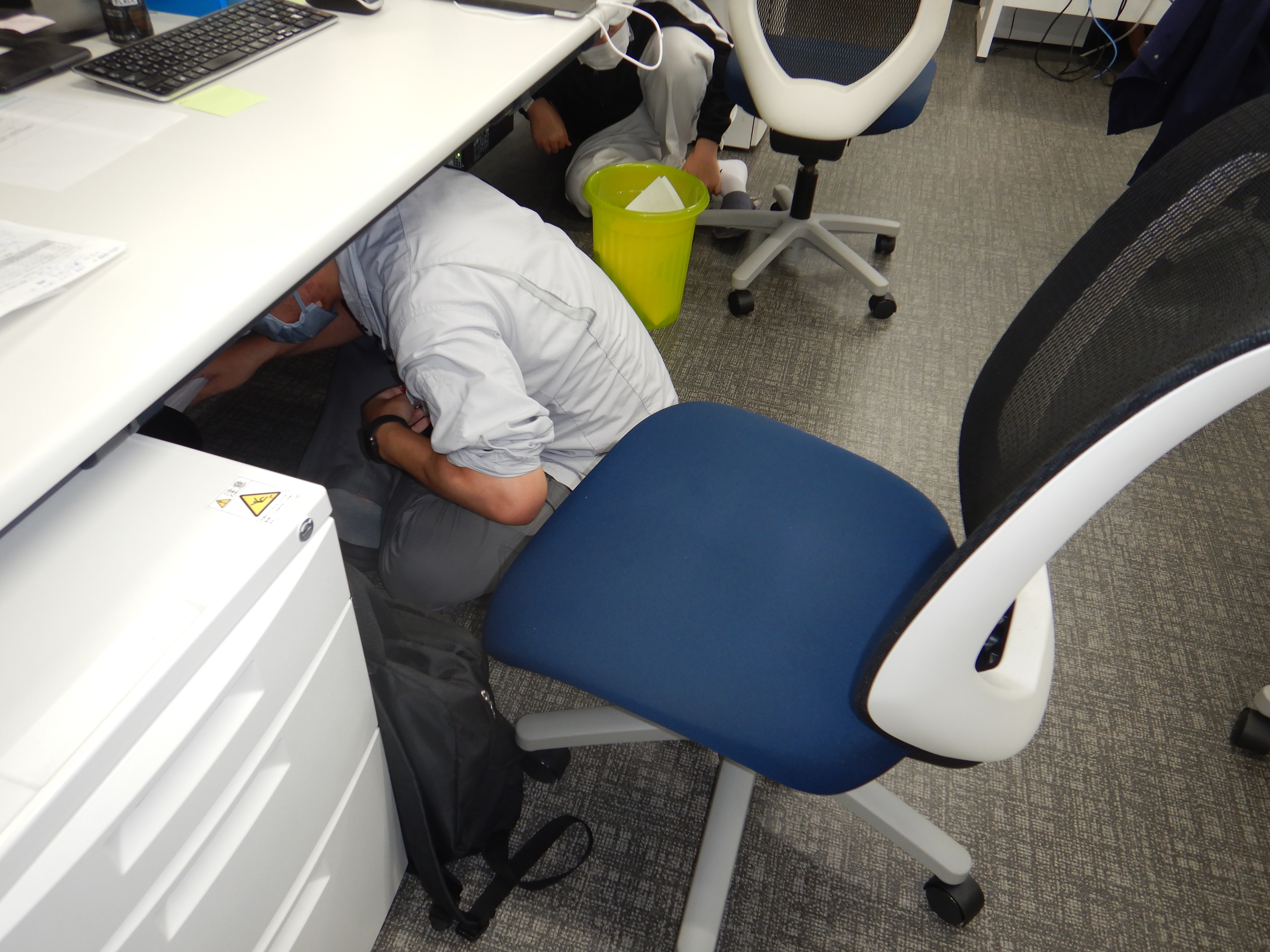 午前10時に社内放送を実施し、社員全員で①姿勢を低く、②頭を守り、③動かない の3つの安全行動を1分間実施しました。