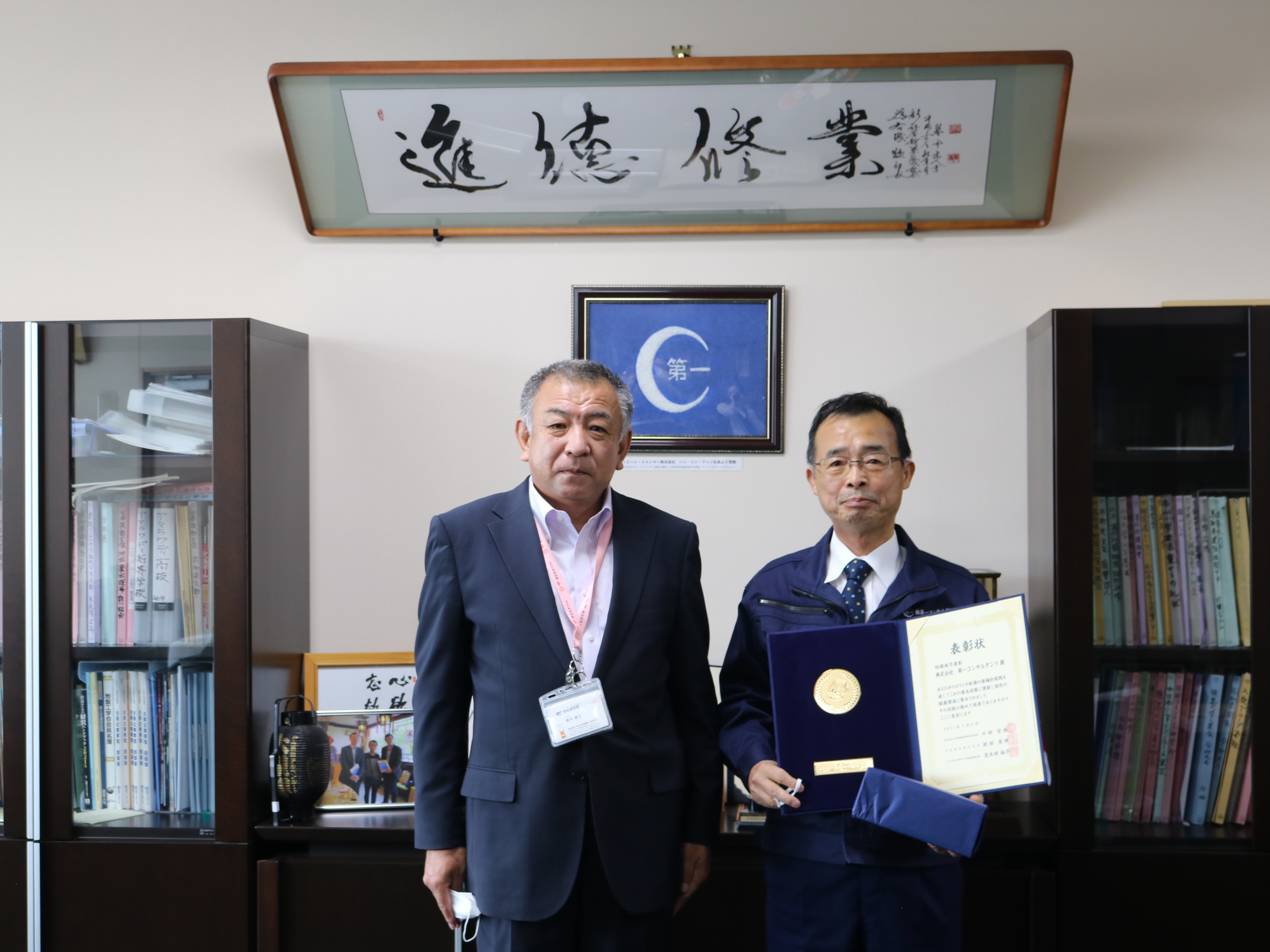 弊社では社員の健康づくりや生産性の向上を目的として、毎日15:00に社員全員でラジオ体操を実施しており、その取り組みが認められ、本年7月にかんぽ生命様より「2021年度ラジオ体操優良団体等表彰・地方表彰」を受賞、本日表彰状をいただきました。