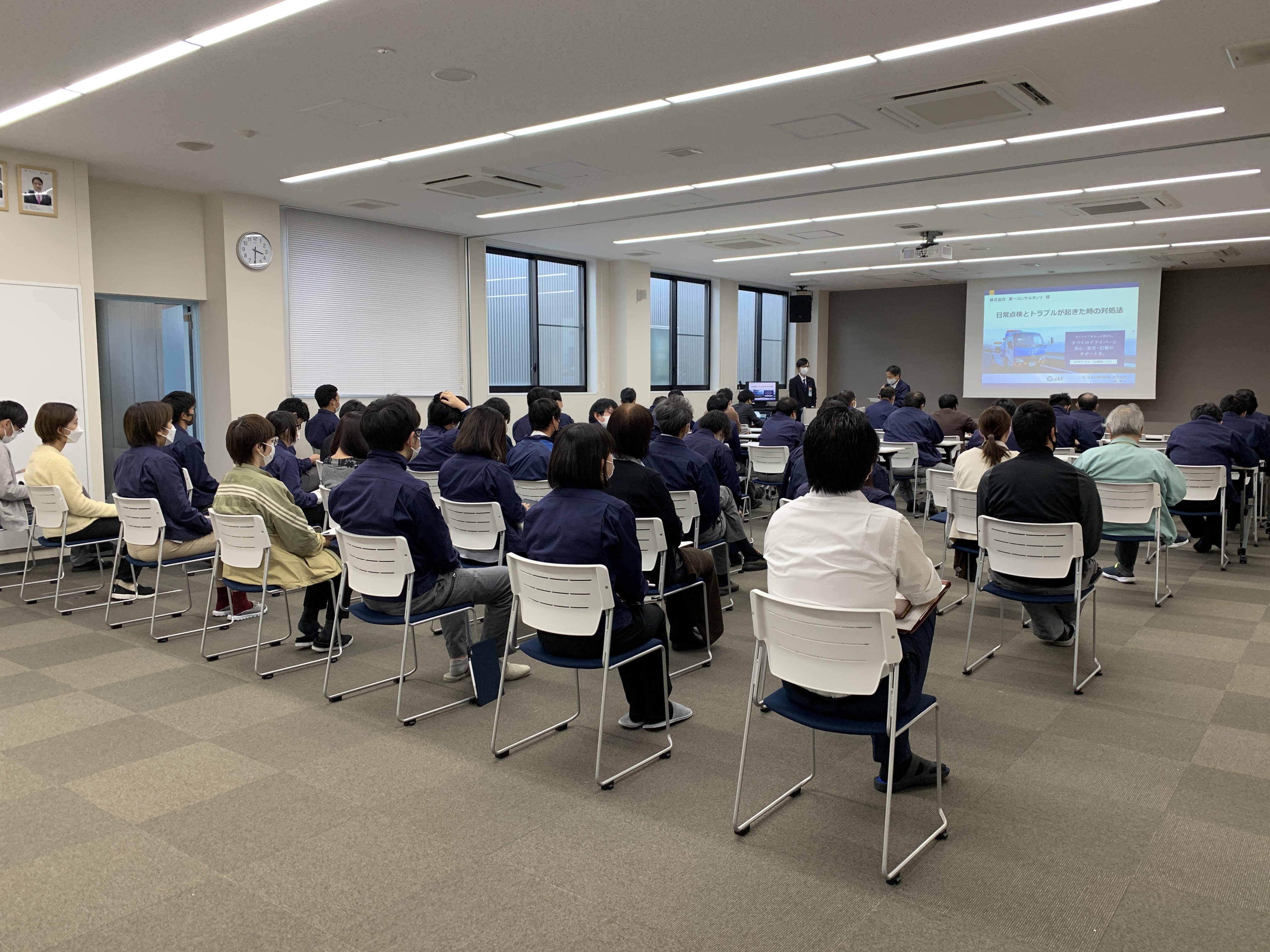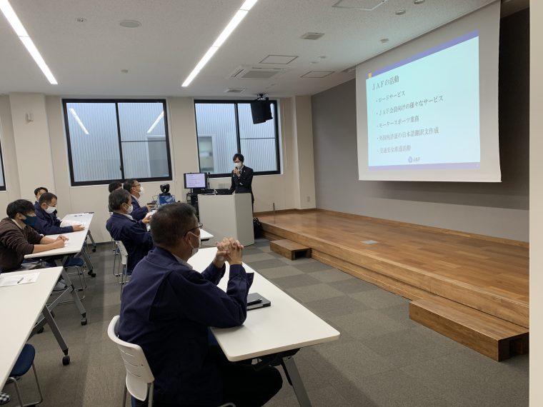 弊社では、春と秋の年2回、安全管理に関する社内全体会議を開催しています。今回の会議は、安全衛生講習として約70名が参加し、一般社団法人日本自動車連盟 高知支部(JAF高知支部)の森様より下記の内容で交通安全に関するご講話をいただきました。