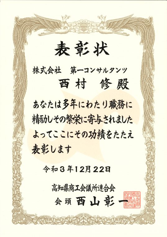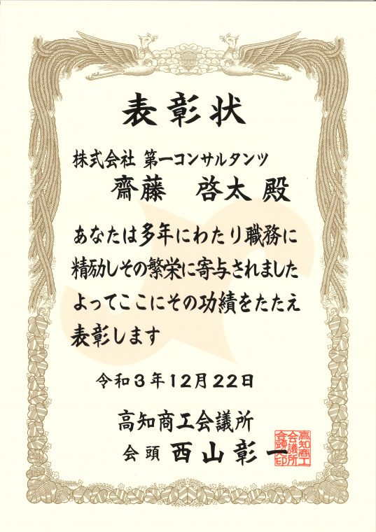 当社も当表彰式に参加しており、今年度は➁の理由により、インフラ調査課 西村 修さん、道路交通課 齋藤 啓太さんを推薦致しました。表彰式は同日、高知商工会議所で行われました。