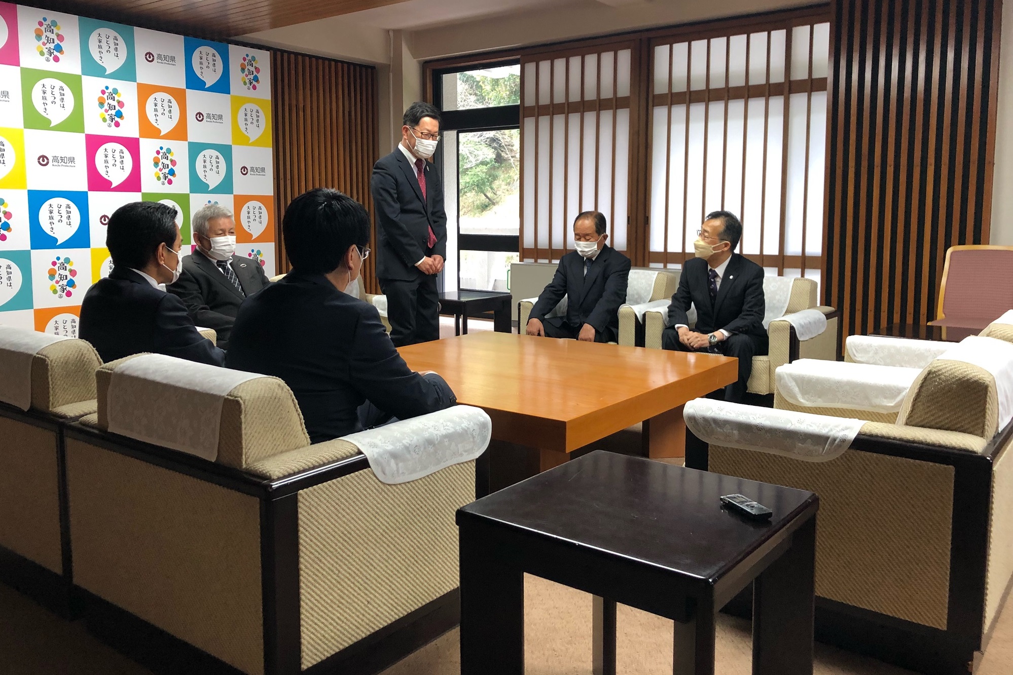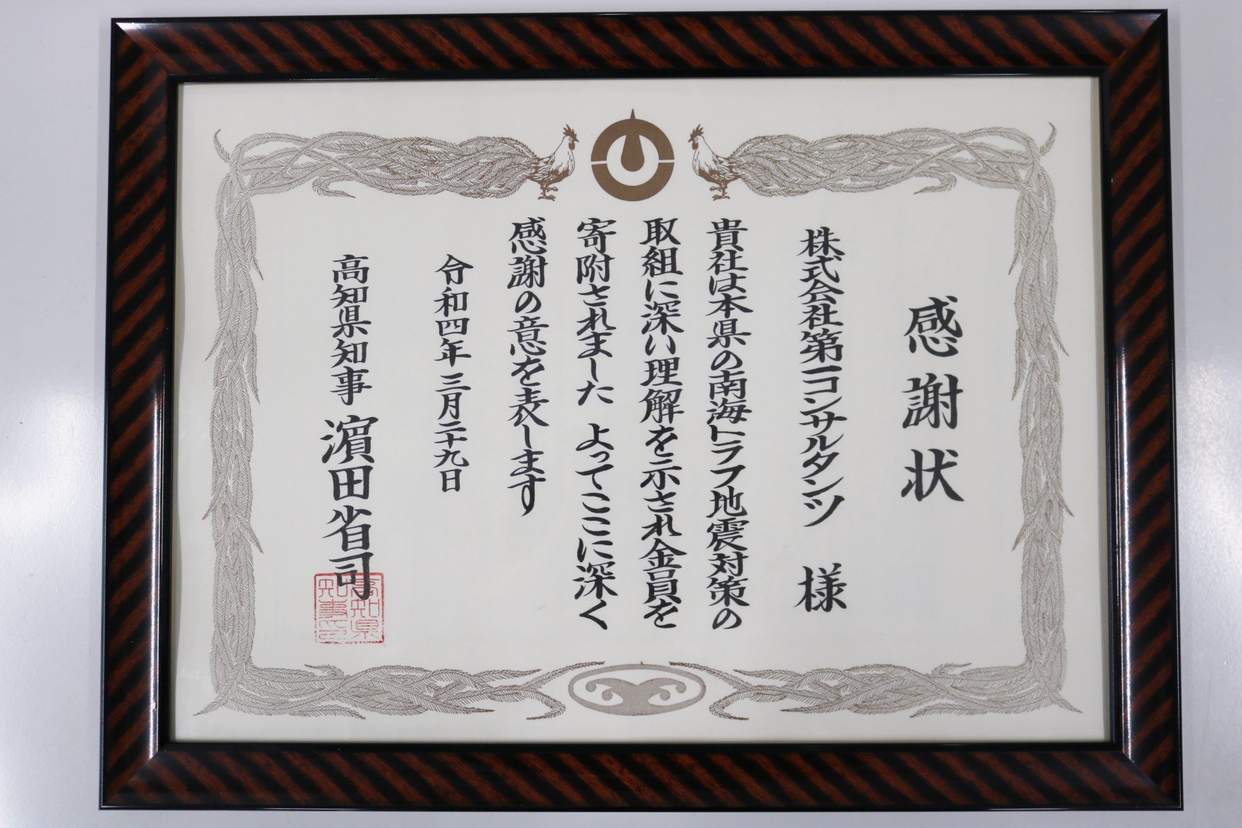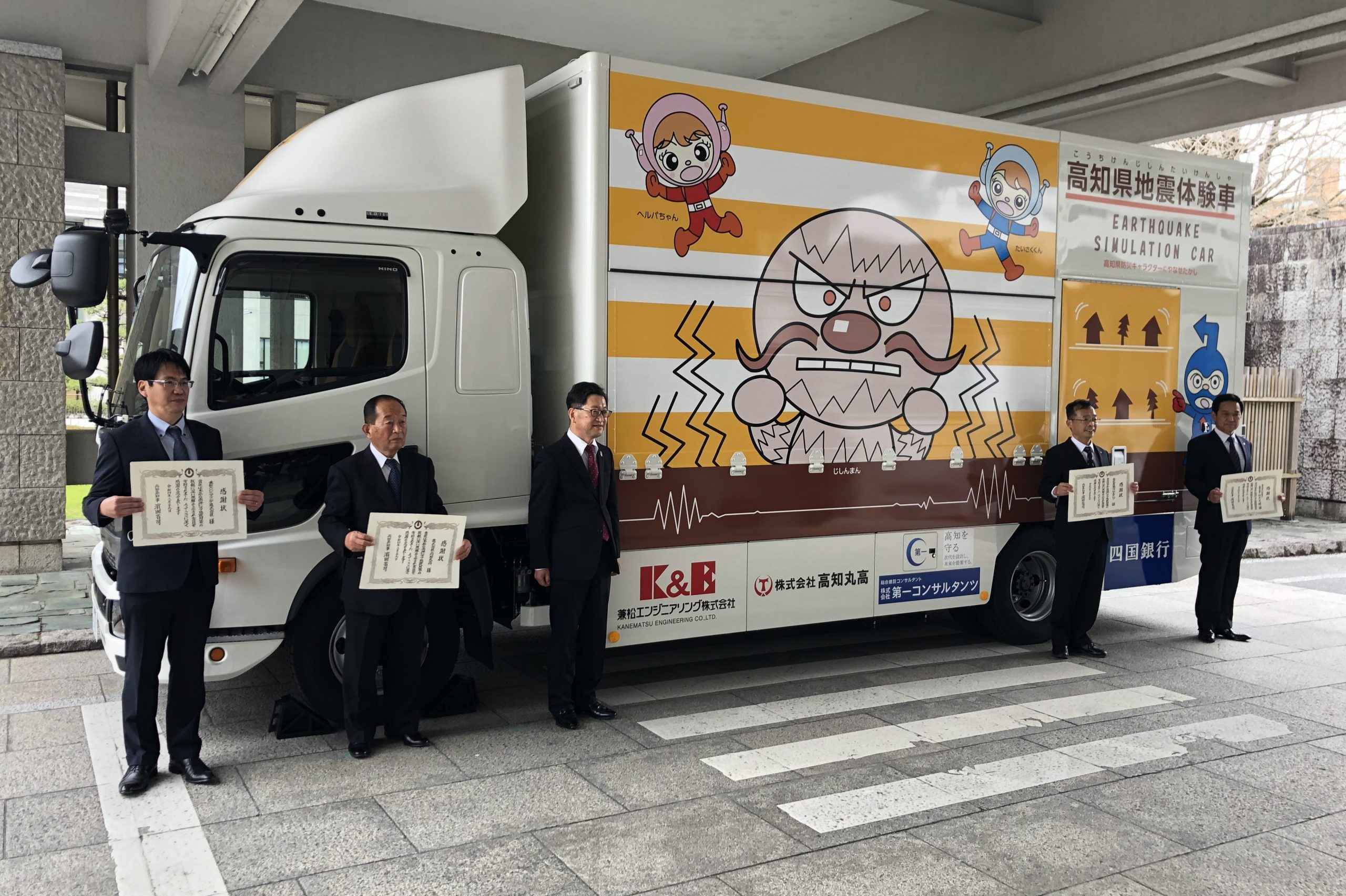本日、高知県庁にて、起震車更新プロジェクトへの寄付金に係る感謝状贈呈式が開かれ、同プロジェクトへの協力により車体に企業名等を掲出できることとなった弊社を含む4社が、濵田県知事から感謝状をいただきました。