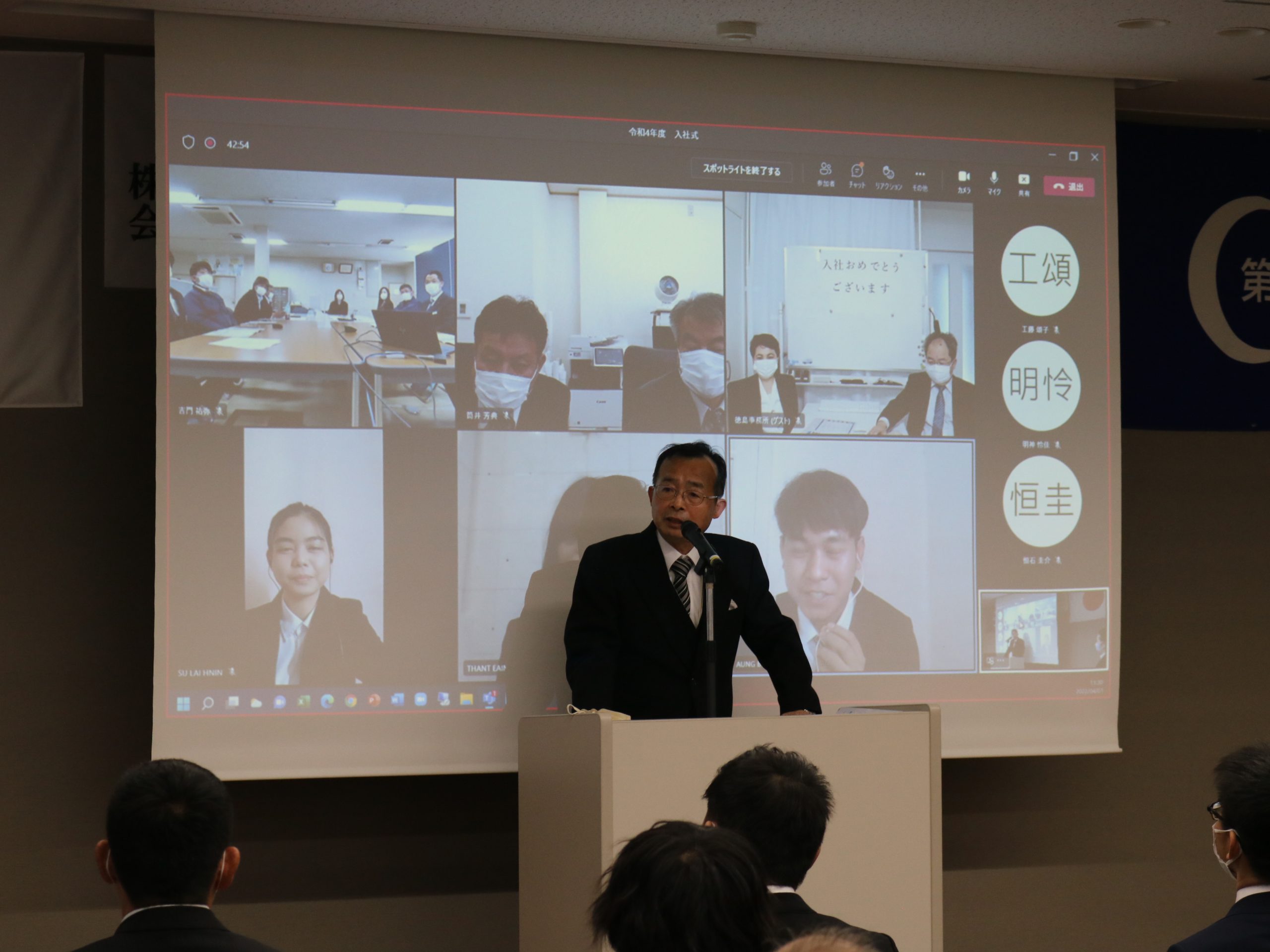 昨年4月に入社していただいたスーさん、タンさん、アウンさんにはウエブで参加していただいています。