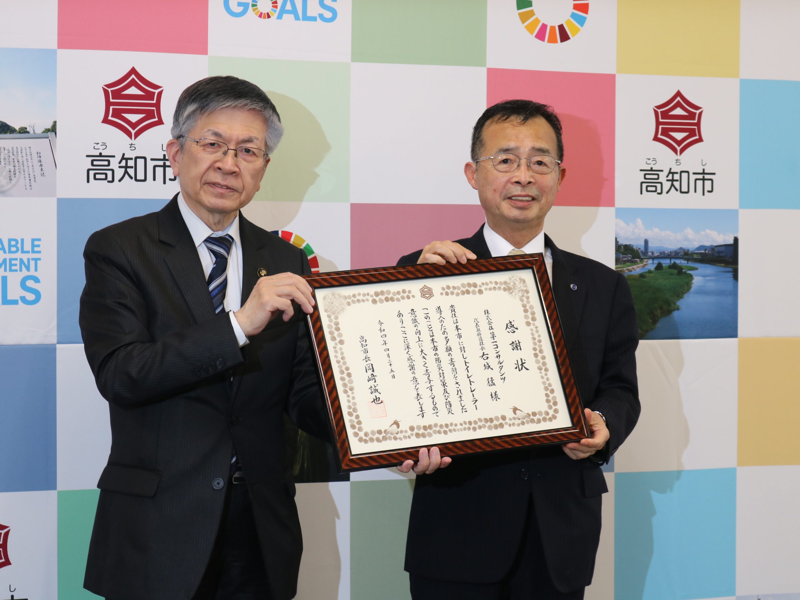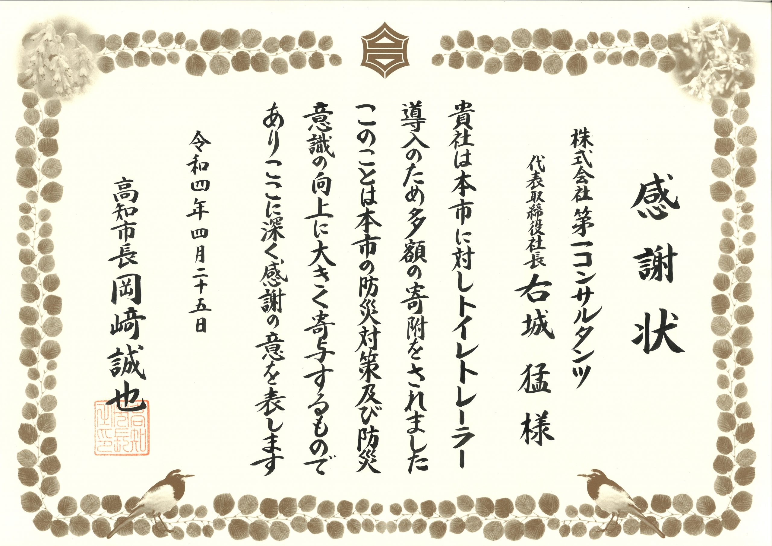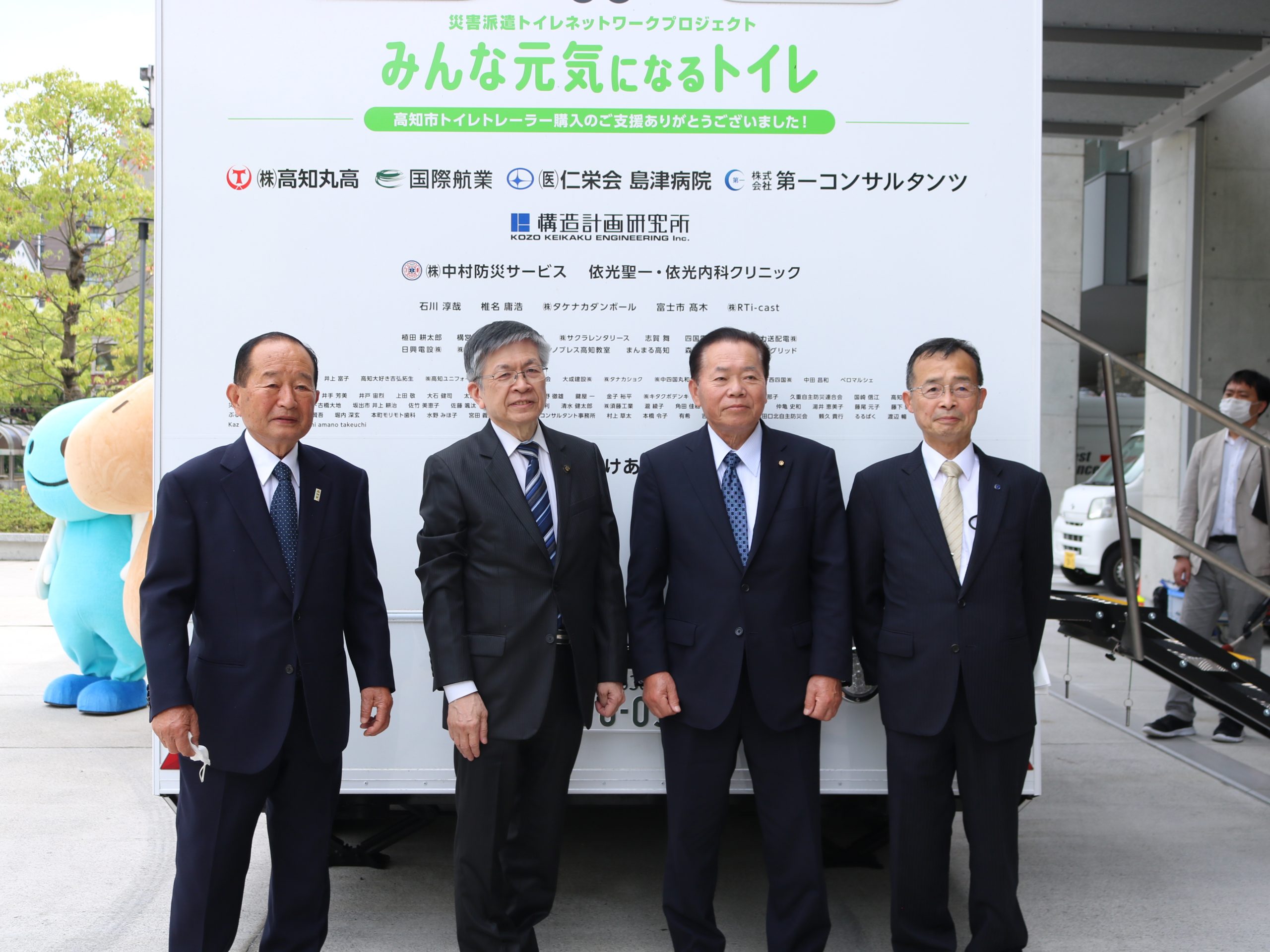 昨年、高知市は”災害派遣トイレネットワークプロジェクト「みんな元気になるトイレ」”(注)への参画を決定。同市からのトイレトレーラー購入資金の支援への呼びかけに対して、当社は100万円の寄付をさせていただいておりました。