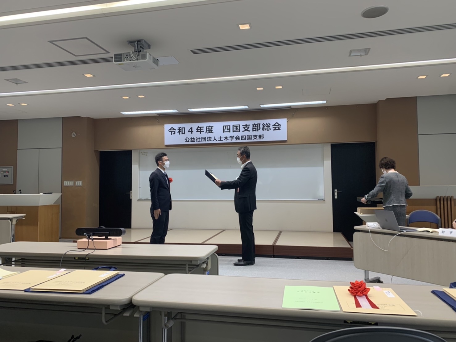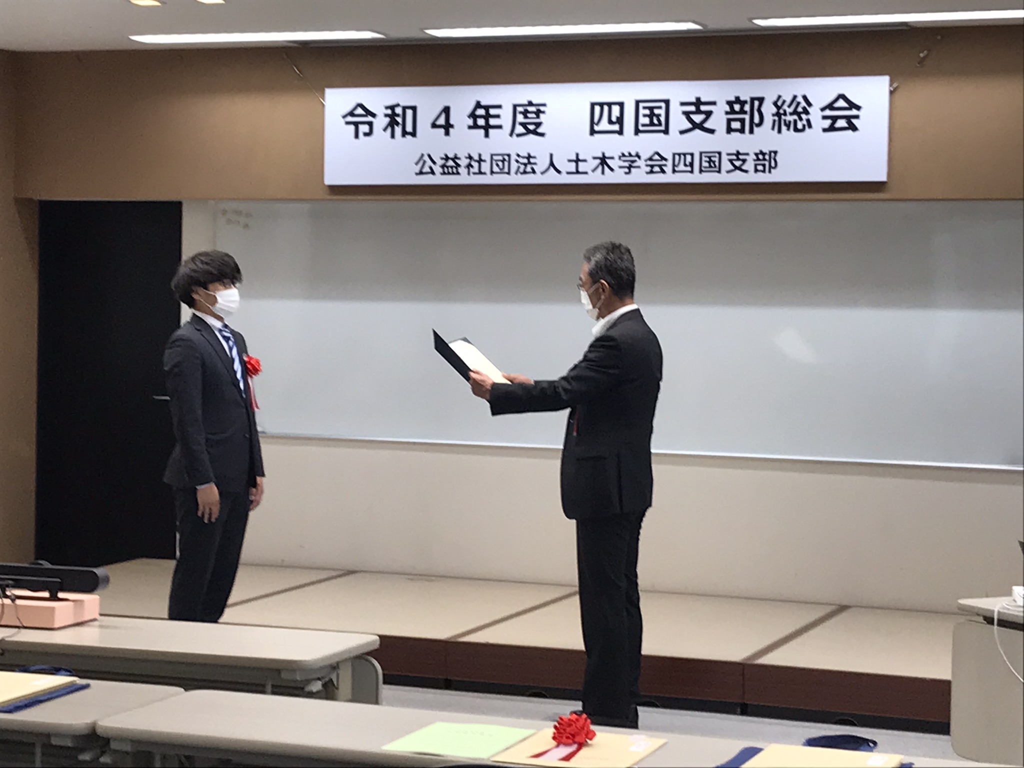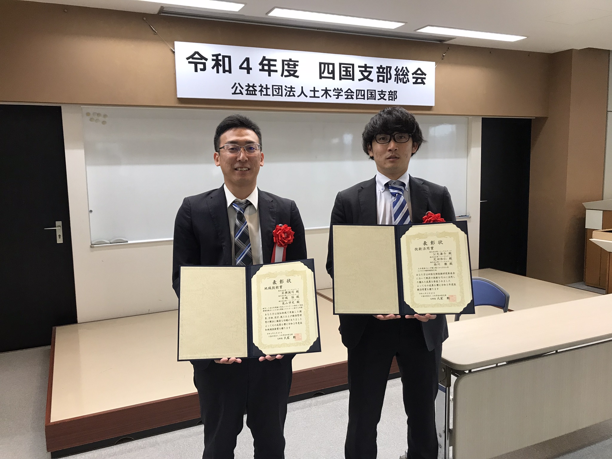 土木学会四国支部総会が香川県高松市で開催されました。総会では、令和3年度土木学会四国支部賞の表彰式が行われ、受賞者を代表して弊社から2名が出席しました。