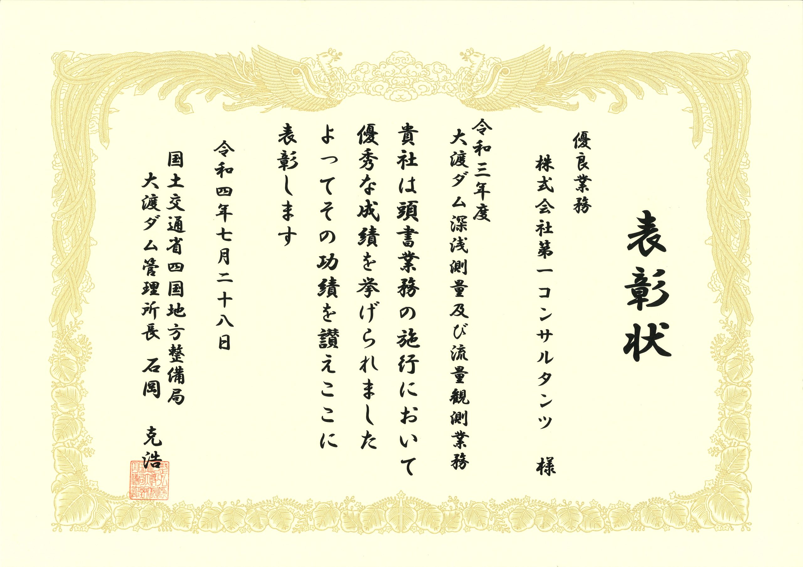 「令和三年度 大渡ダム深浅測量及び流量観測業務」が優良業務表彰、この業務の主任技術者である三浦貢一が優秀建設技術者表彰を受賞しました。