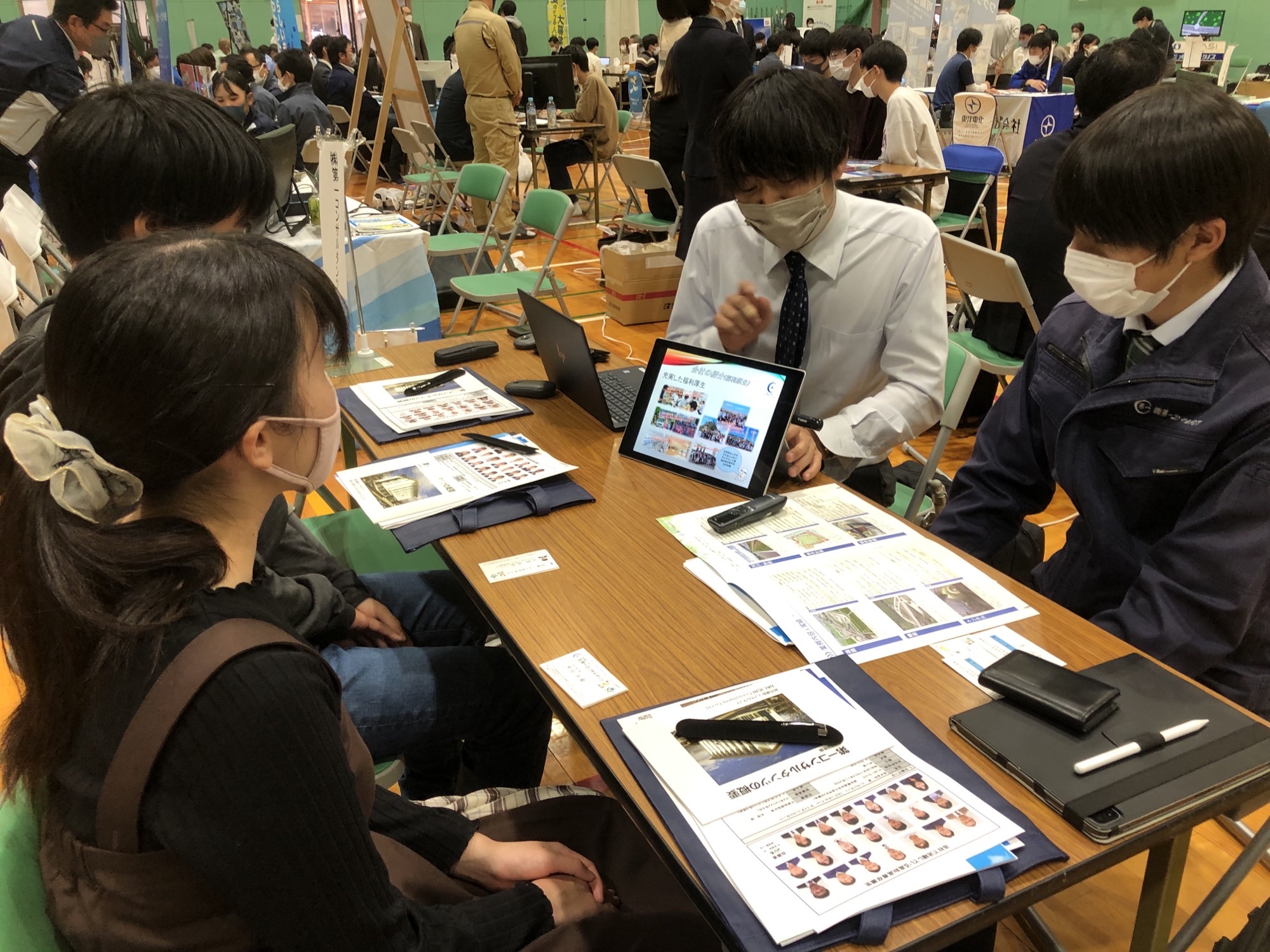 開会の挨拶の後、参加学生が約3時間の限られた時間の中で各企業のブースを訪問していました。訪問してくれた学生さんの中には、2年前の県内企業研究会の際にも訪問してくれた学生や今年の夏にインターンシップに来てくれた学生もおり、大変嬉しく思いました。また、自分のやりたいことが具体的に決まっている学生さんも多くいて、将来のことを一生懸命考えている印象を受けました。訪問してくださいました学生の皆さまありがとうございました。