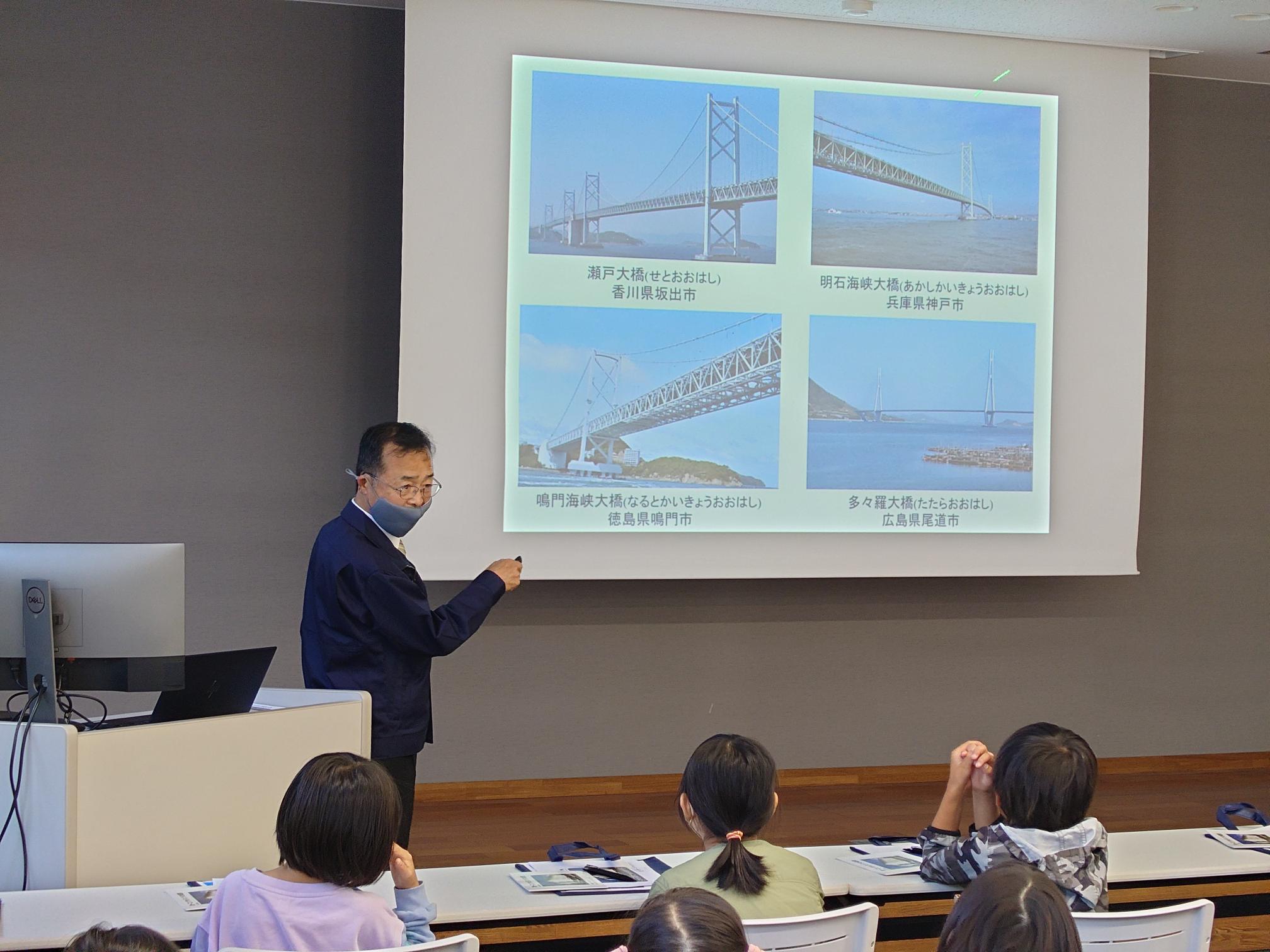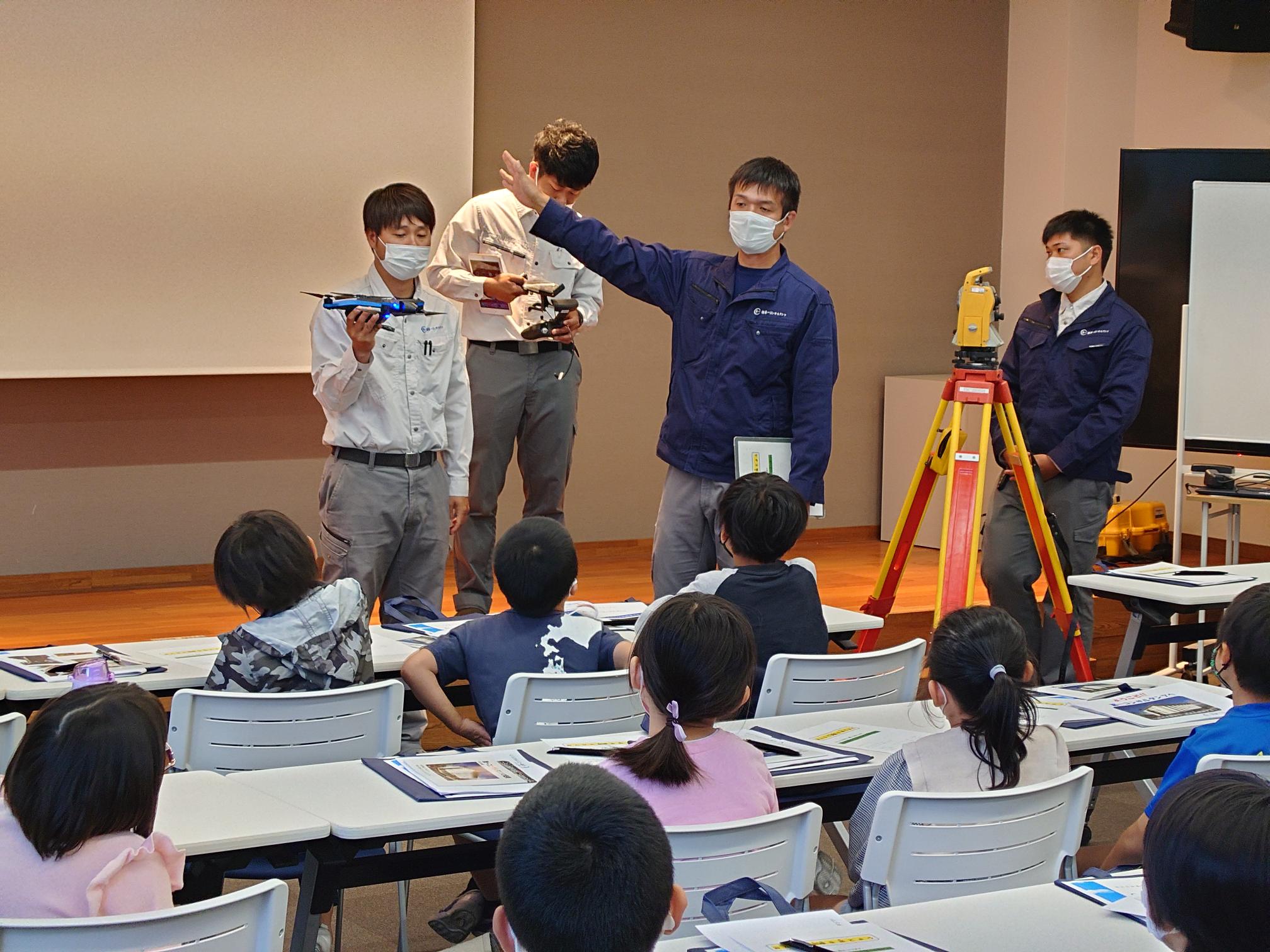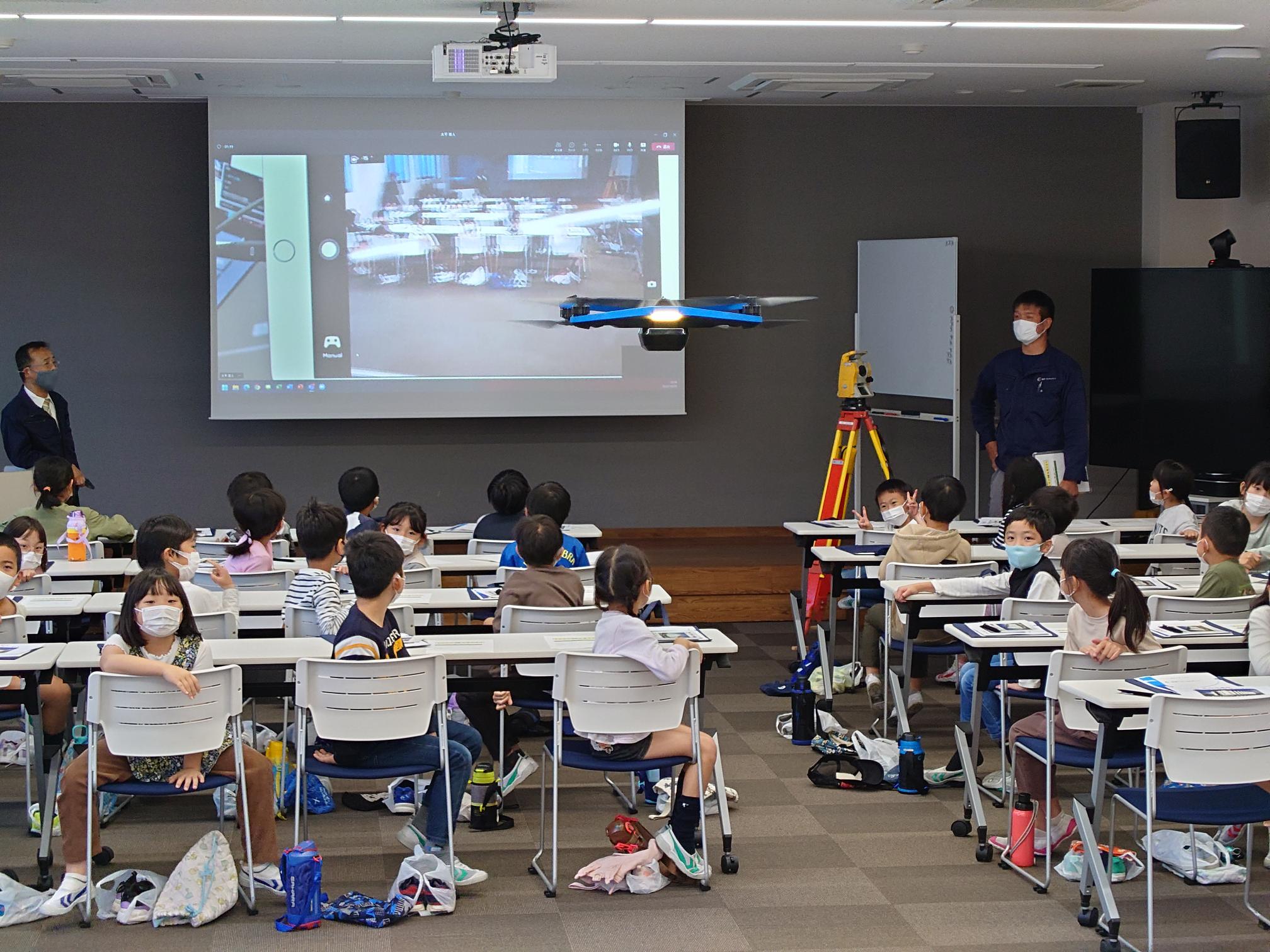 はじめに、子ども達からの挨拶があった後、当社のCMと会社紹介動画を鑑賞して頂きました。当社CMについてはたくさん子ども達から「テレビで見たことある」といった嬉しい言葉が飛びかっていました。その後の質問コーナーでは子ども達が疑問に思っていることについて、お答えさせて頂きました。「道路、トンネル、橋」に関するたくさんの質問を頂き、当社のお仕事について少し興味を持って頂けた様子でした。最後は、子ども達にテープの長さ当てクイズに参加して頂いたり、研修室の後方でカメラ付きのドローンを実際に飛ばしてドローンからの映像を見て頂きました。ドローンから見える映像に子ども達は興味津々でした。