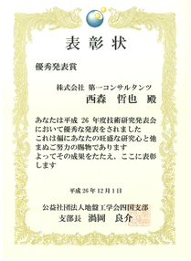 平成26年度 地盤工学会四国支部技術研究発表会にて優秀発表賞受賞(2014/12/19)