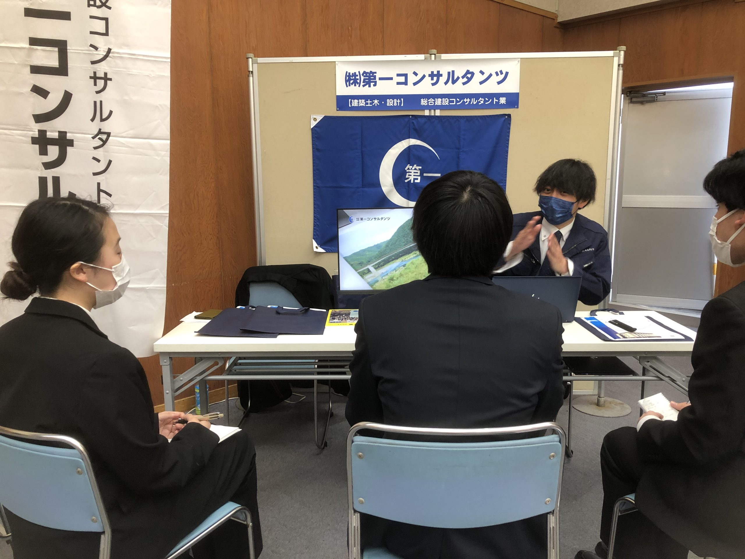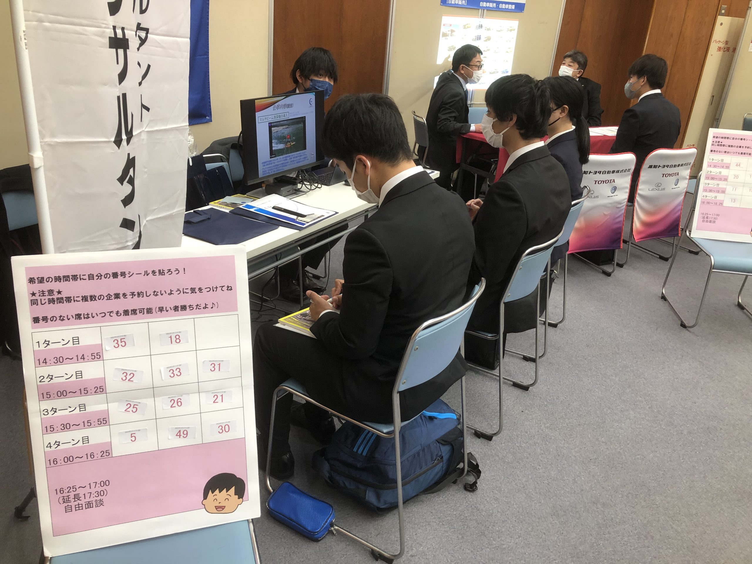 各社3分スピーチの後、ブースの訪問が始まりました。今回もタイムスケジュール制を導入しており、企業のスピーチ終了後に学生さんが面談を希望する企業ブース へ事前予約をする時間が設けられていました。1ターン~4ターンで各25分の面談時間でしたが、たくさんの学生が訪問してくださり説明にも熱が入りました。また、学生の方からも将来取り組んで行く仕事に対しての具体的な質問も多く、就職活動に対して真摯に取り組んでいる姿勢が感じられました。面談に来て頂いた学生の方、ありがとうございました。