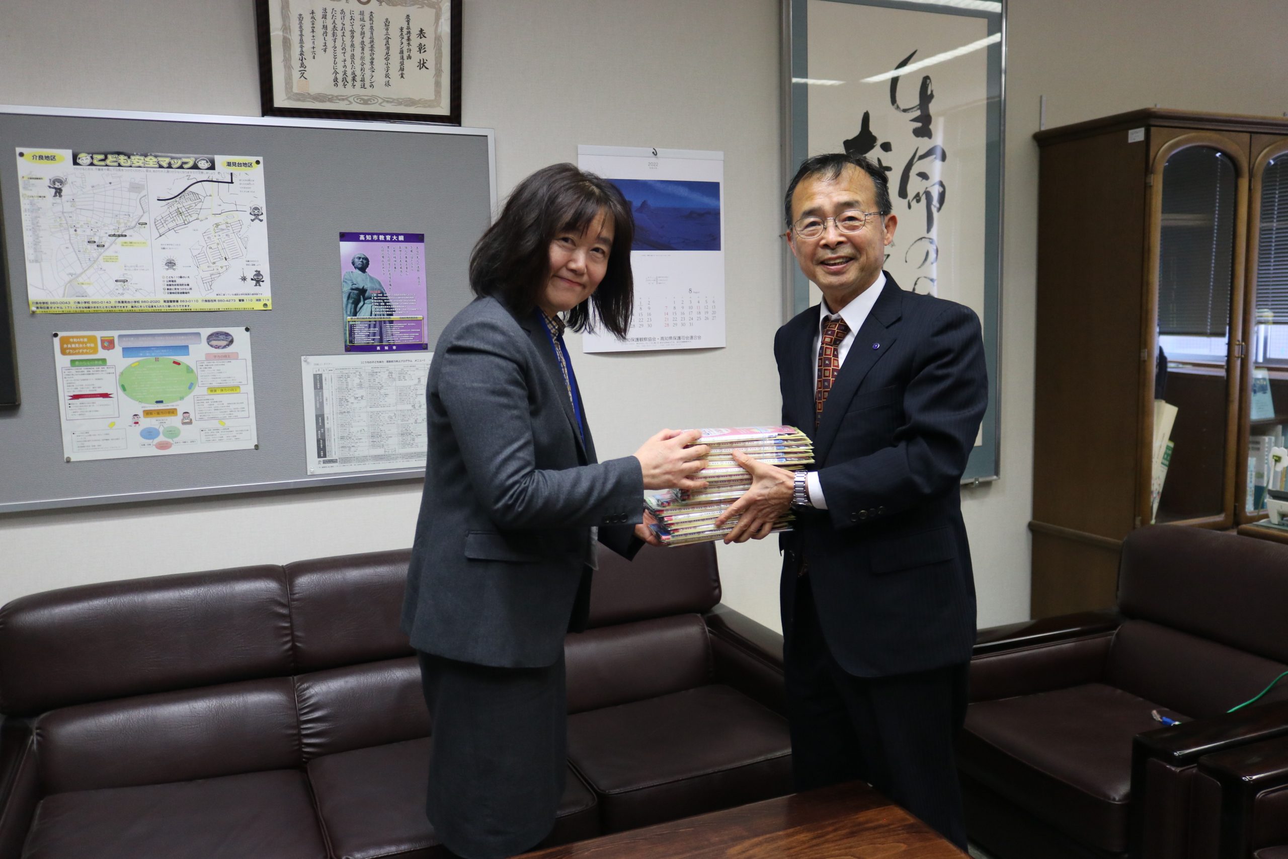介良潮見台小学校の吉永校長先生に鉛筆を贈呈する右城社長