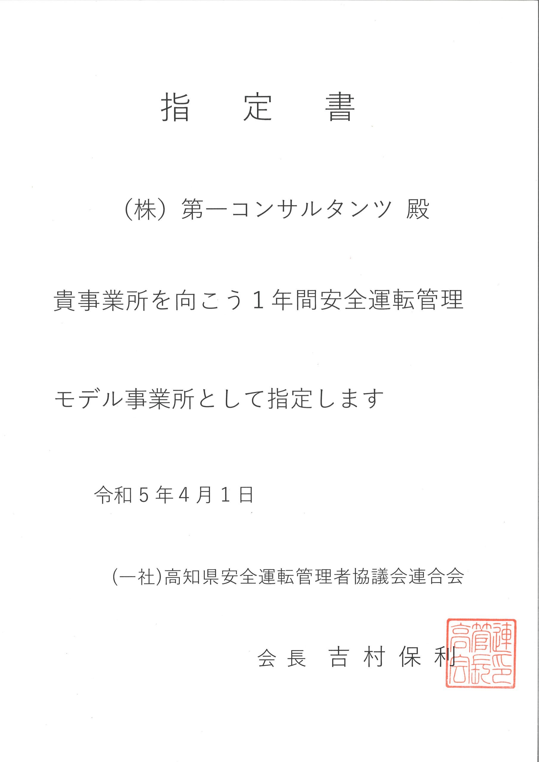 弊社は、(一社)高知県安全運転管理者協議会連合会より、令和5年度「安全運転管理モデル事務所」に指定されました。