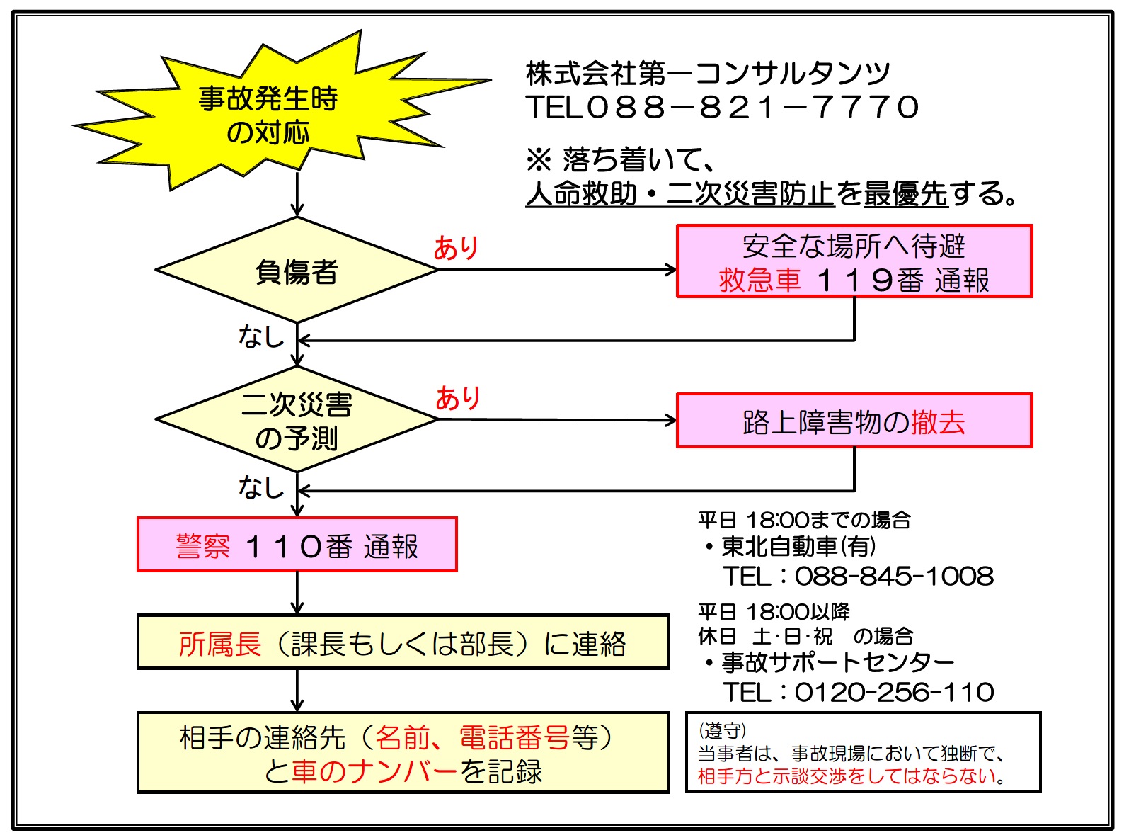 なお、万一の事故に備えて全ての社有車には「事故発生時のフロー」を設置しており、事故発生時にはフローに従って対応しています。