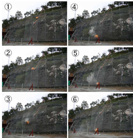 3. 日本で初めて実物規模の防護ネットに重錘衝突実験を実施し, 400kJの落石エネルギーを吸収できることを確認。