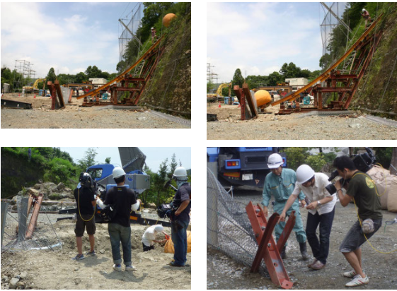 | 目 的 | 2009年7月13日,富士山新五合目駐車場で落石が防護柵を突破してキャンピングカー直撃した落石事故を検証するために実験。 |